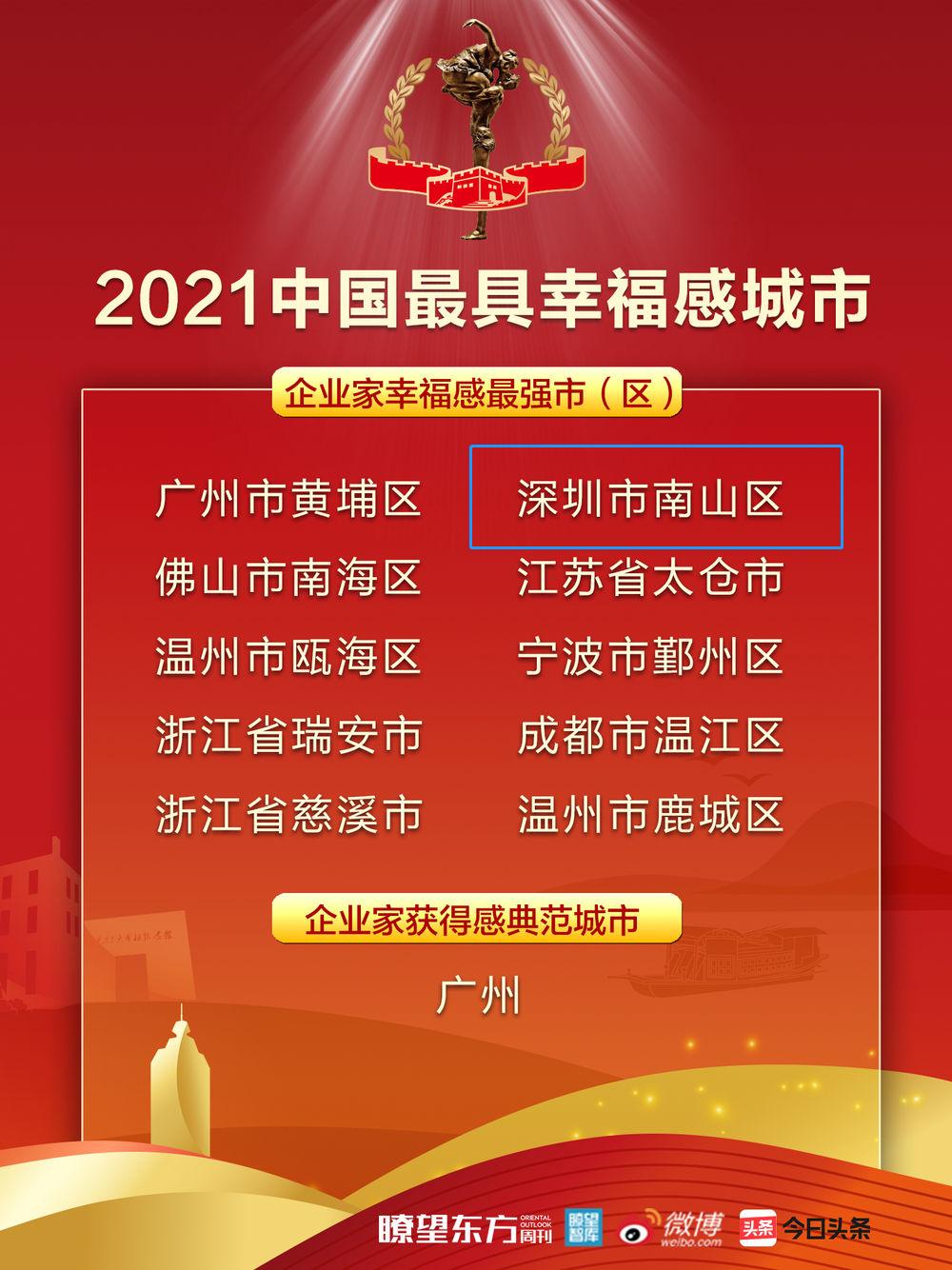 今年幸福城市调查的特色之一,就是进行了企业家眼中的城市幸福感调研,主要是在县级城市和城区两个层级进行。调查结果显示,深圳市南山区等城市(区)被推选为“2021企业家幸福感最强市(区)”。