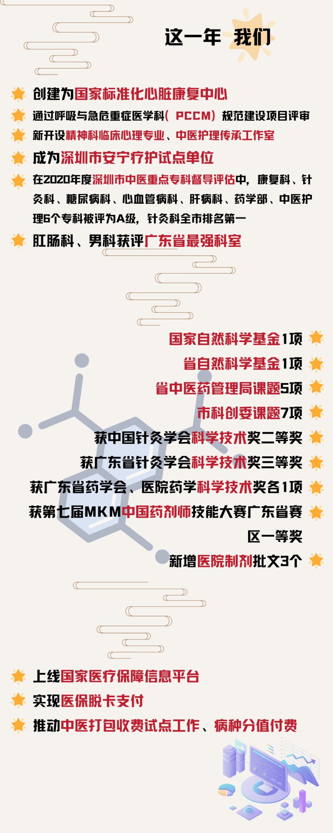 把握中医药事业发展的新形势新机遇新特征,立足现有基础条件,对标一流中医医院,以“学科建设年”为年度主题,以“三项建设,三大战略,三个推进”为主线推进年度工作,形成全方位、多层次的学科发展格局,打造智慧化、先行示范中医医院集团,助力中医药传承创新发展先行示范城区建设,为建设深圳先行示范区标杆城区提供健康保障。