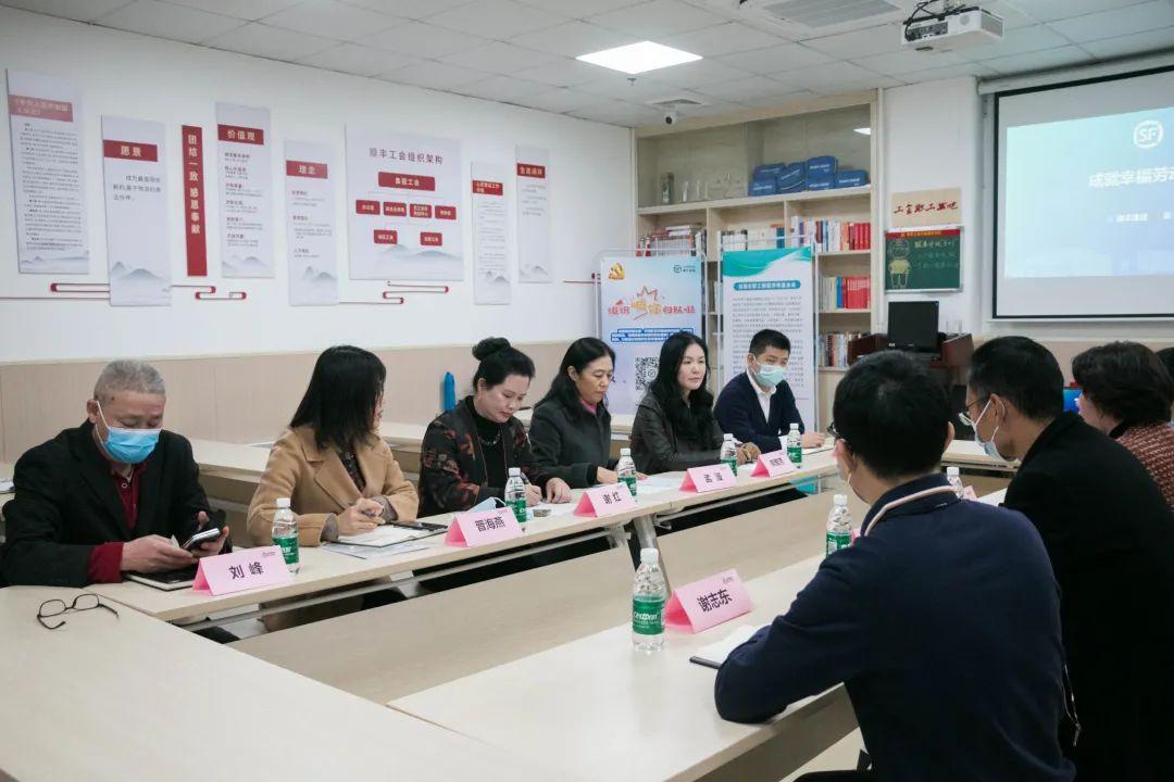 2021年12月28日下午,在沙头街道顺丰速运营业点,顺丰工会主席曾昭霞、顺丰(深圳区)工会主席杜申运等向福田区总工会一行介绍顺丰工会的组织架构、管理模式、工会服务的亮点及特色。为更好地为职工服务,顺丰工会以“成就幸福劳动者”为使命,特设“幸福五指数”,力求保持沟通顺畅,随时随地倾听员工声音,解决员工需求,在工作与生活各方面提供帮助。