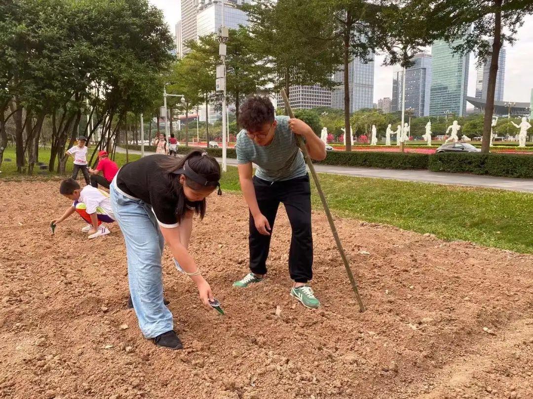 我是一名出生在福田的深二代,向日葵一直就是我最喜欢的花。有一次,妈妈在公众号上看到深圳市民中心前的花园需要播种向日葵,据说还是彩色向日葵,我立刻报名参加了。播种我喜爱的向日葵,在我美丽的家乡深圳福田,这是一件多么有意义的事啊!早早的我们一家就来到了聚集地,我和爸爸在组织的义工那里领取了向日葵种子,还分得了一块地,我们很认真的把种子撒在土里,一步一播种,每个播种点三四粒种子,严格按照要求。大概一个半小时,我们的地里都被埋下了种子。累是累了点,但心情是很愉悦的。妈妈给得意洋洋的我们拍了张“地主照”。