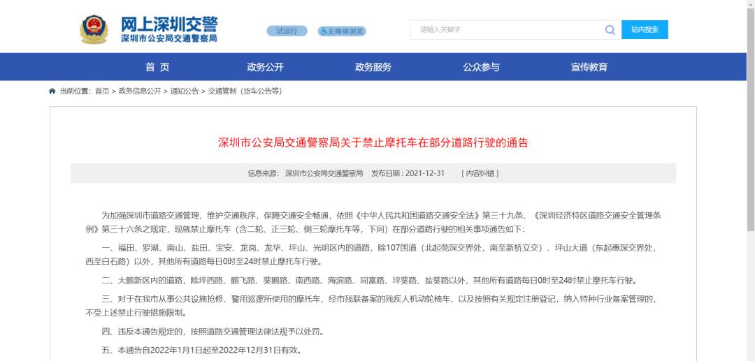 据深圳市公安局交通警察局发布的《深圳市公安局交通警察局关于禁止摩托车在部分道路行驶的通告》,自2022年1月1日起至2022年12月31日,禁止摩托车(含二轮、正三轮、侧三轮摩托车等,下同)在部分道路行驶。
