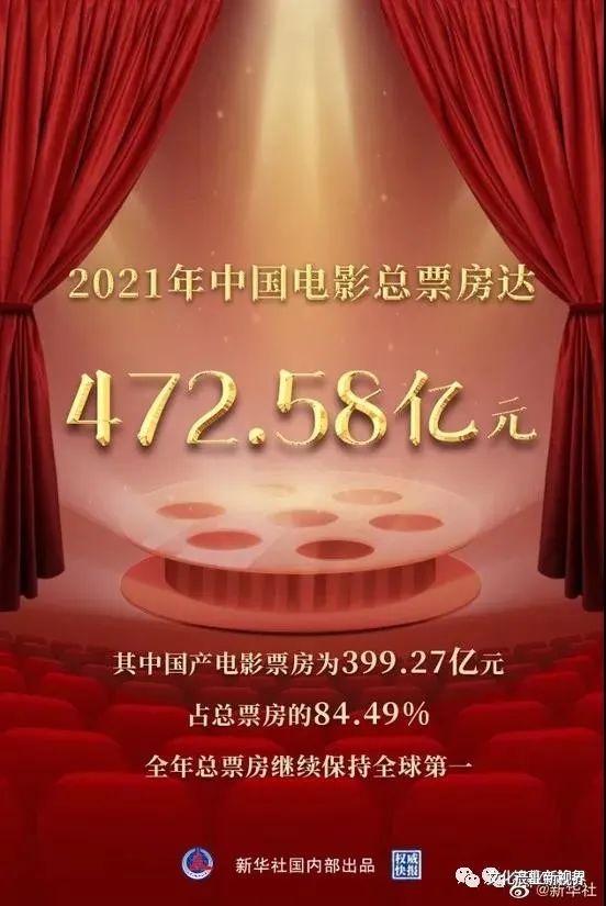 国家电影局2022年1月1日发布数据,2021年中国电影总票房达472.58亿元,其中国产电影票房为399.27亿元,占总票房的84.49%。全年新增银幕6667块,银幕总数达到82248块。中国电影产业快速复苏发展,全年总票房和银幕总数继续保持全球第一。
