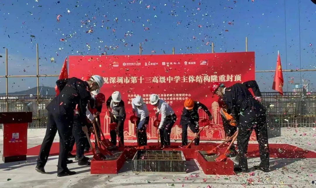 随着5栋大跨度屋盖整体提升及8A栋屋面浇筑完成,由中建科工承建的深圳市第十三高级中学主体结构完成全面封顶。