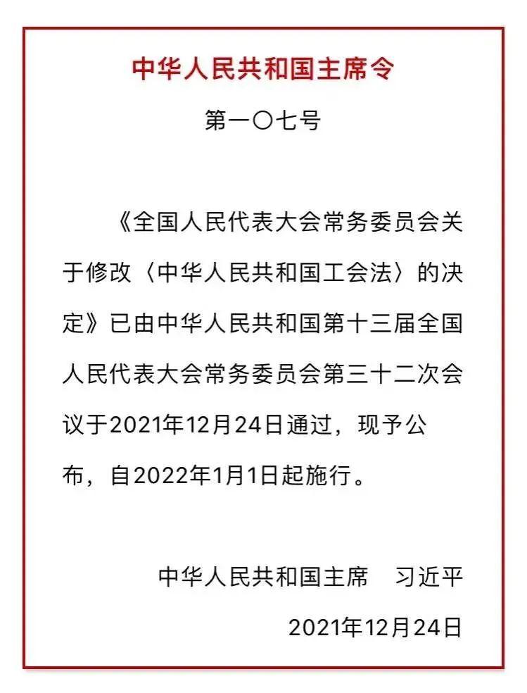 十三届全国人大常委会第三十二次会议24日完成对工会法的修改,修改后的工会法于2022年1月1日实施。