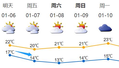5日夜间到6日早晨有轻雾和零星小雨,6日白天渐转多云,气温15-22℃;