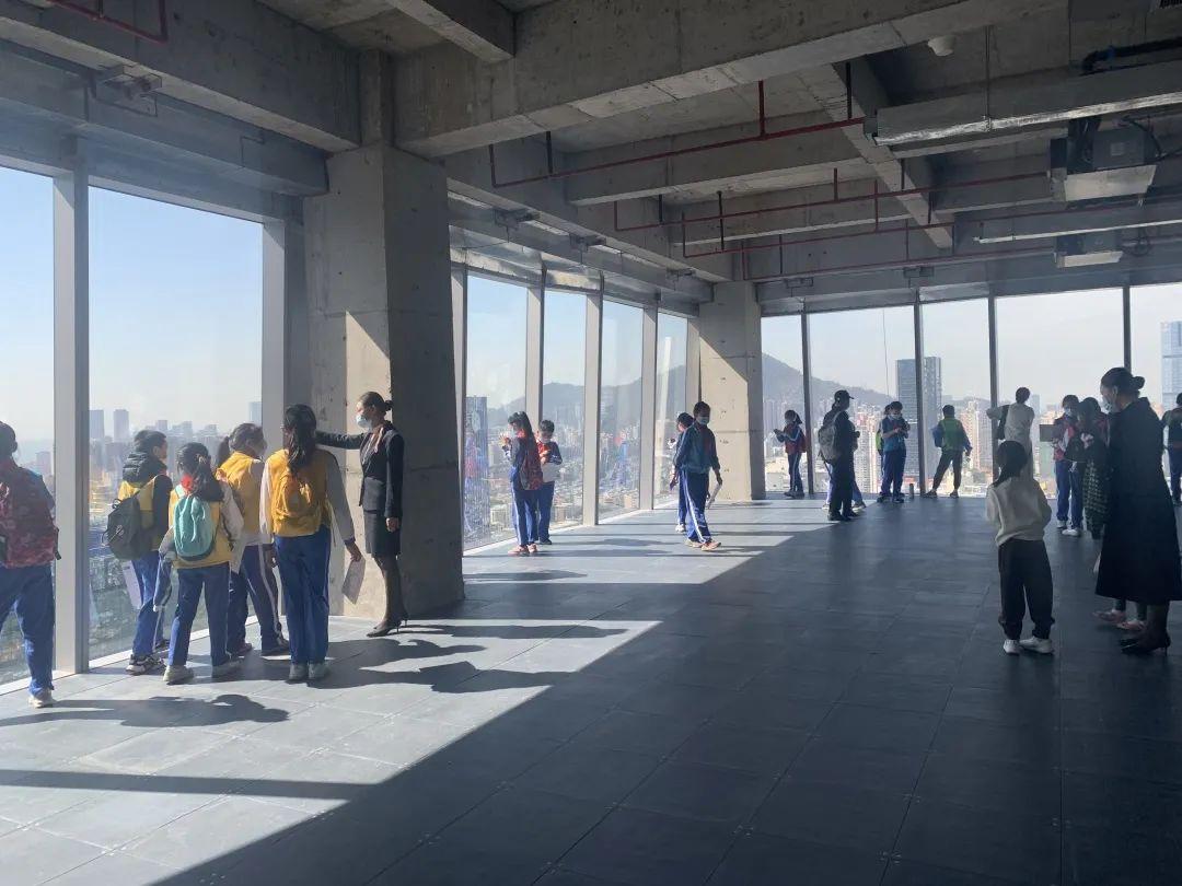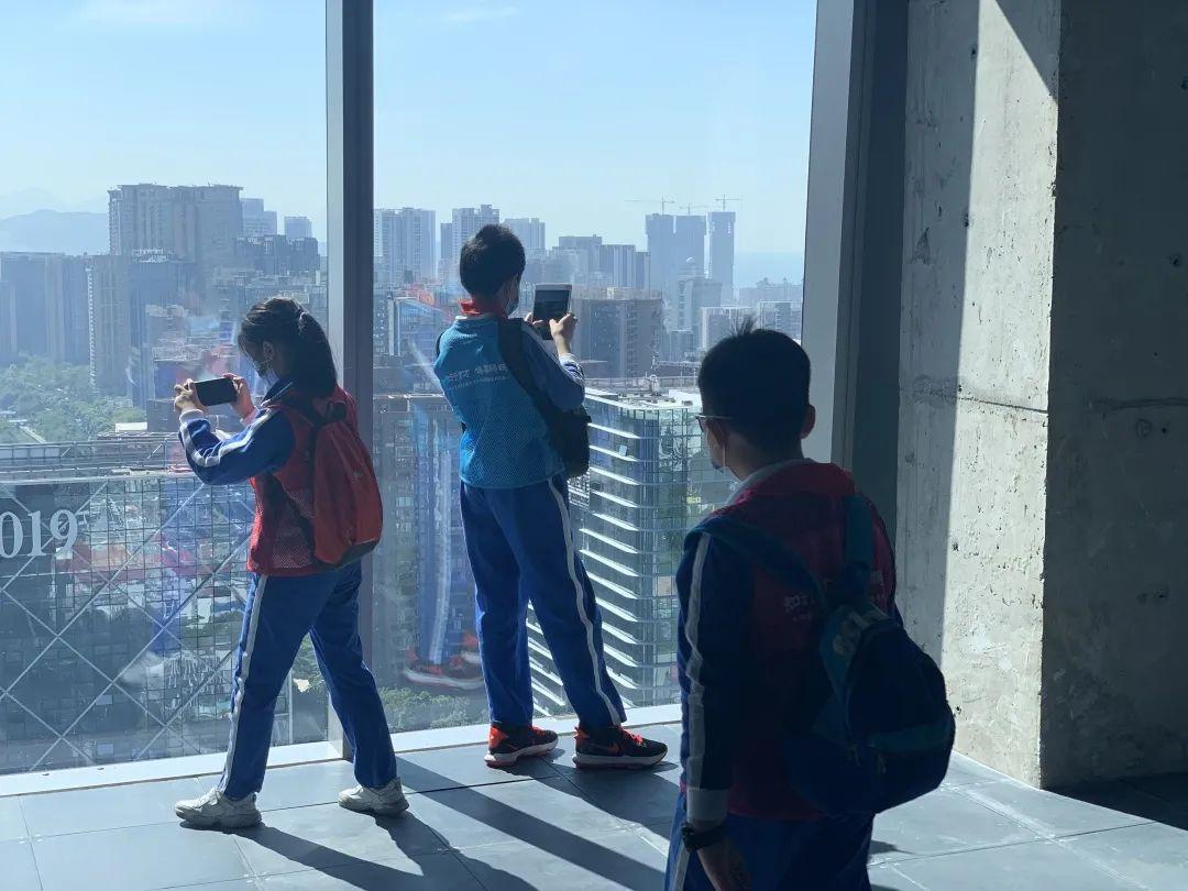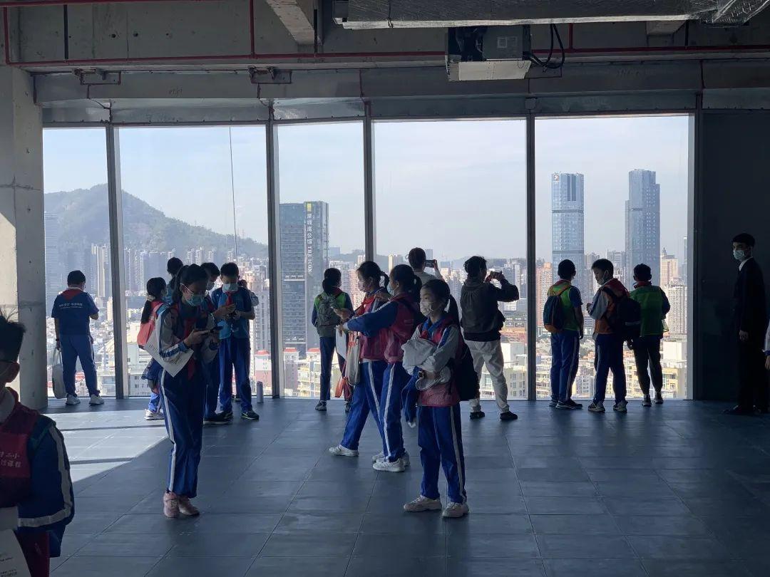 活动第二阶段,同学们被邀请至与博物馆相邻的喜之郎大厦,登临顶层并得益于其独特格局,跟随讲解员的脚步俯瞰环览深圳湾城市森林,更为直观地感受到了钢结构世界的壮伟与宏大。