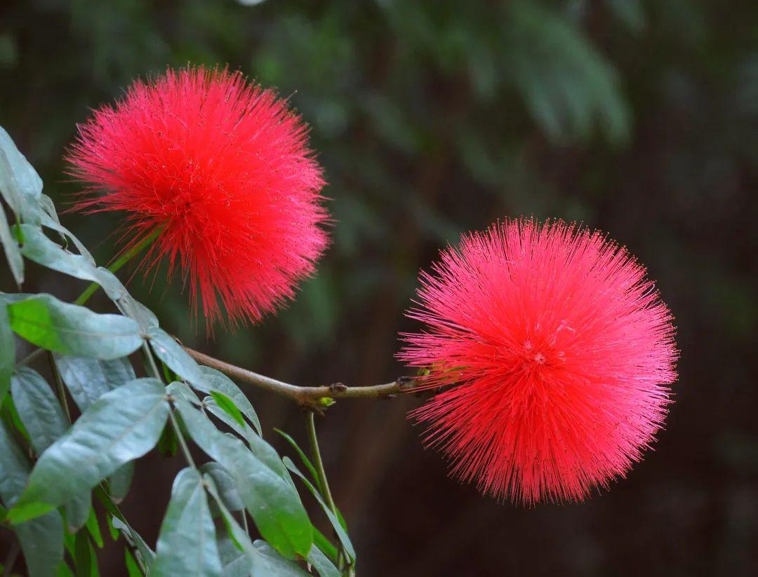 半落叶灌木或小乔木。二回偶数羽状复叶,冬末春初萌发新叶,嫩叶红色,再由红变粉红至淡绿色。头状花序腋生,花丝红色,聚成一个红色的小绒球。