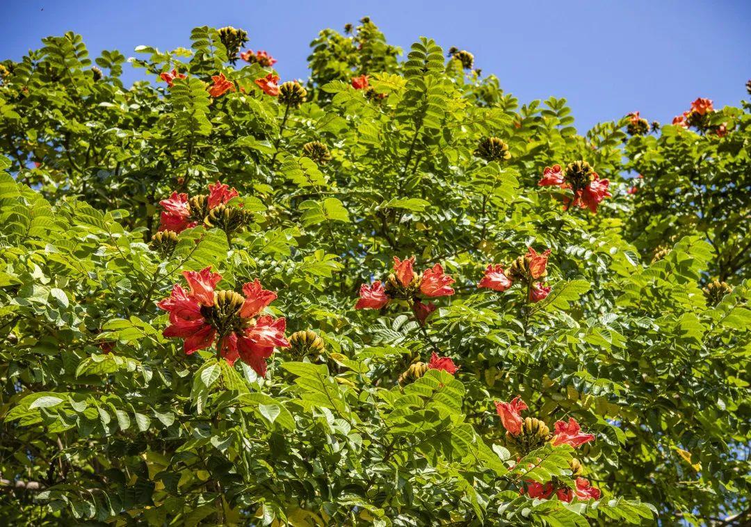 常绿乔木。花大,花萼佛焰苞状,花冠橙红色,开花时,花朵自外围向中心逐渐开放。
