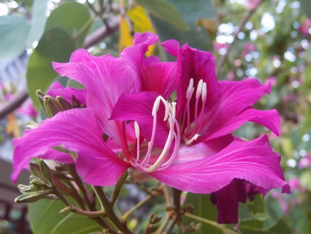 半落叶乔木。叶革质,顶端2裂。总状花序顶生或腋生,花冠紫红色,通常不结果。本种1965年被定为香港的市花,1997年7月1日香港回归祖国,该花的图案又被定为香港特别行政区区徽。