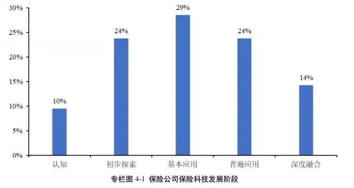 对于目前中国内地保险公司所处发展阶段,当前保险科技发展仍处于认知和初步探索的保险公司占据 34%,处于基本应用阶段的保险公司占据 29%,普遍应用和深度融合阶段的保险公司占据 38%。这反映出中国内地保险公司应用保险科技发展的不平衡状况,一方面,有资⾦和技术的大型保险公司可以更快实现科技融合,⽽而金融科技潮流裹挟下的中小险企只能落后于发展,仍处于初步摸索的阶段,出现“两极分化”;⽽另⼀方面,已经实现保险科技基本应用的险企占比最高,这说明内地保险公司在保险科技应用上仍具备较⼤潜⼒。