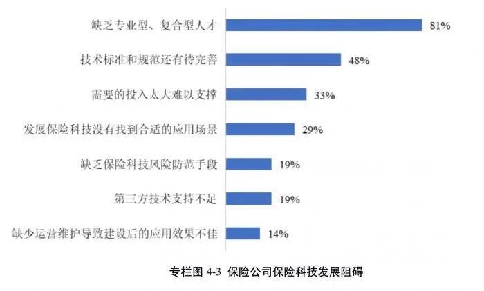 对于保险公司保险科技发展的主要阻碍,81%的受访者表示,自⼰所在公司保险科技发展较慢主要是因为缺乏专业型、复合型人才,说明目前保险科技市场的人才结构和供需并不匹配;也有 48%的受访者认为技术标准和技术规范是保险科技发展中急需解决的问题,33%受访者认为目前保险科技投⼊太大难以支撑,当然有技术无场景也是突出问题(29%),中国内地的保险科技发展仍需要各险企不断深耕自身经营,“因企制宜”地开展科技转型。
