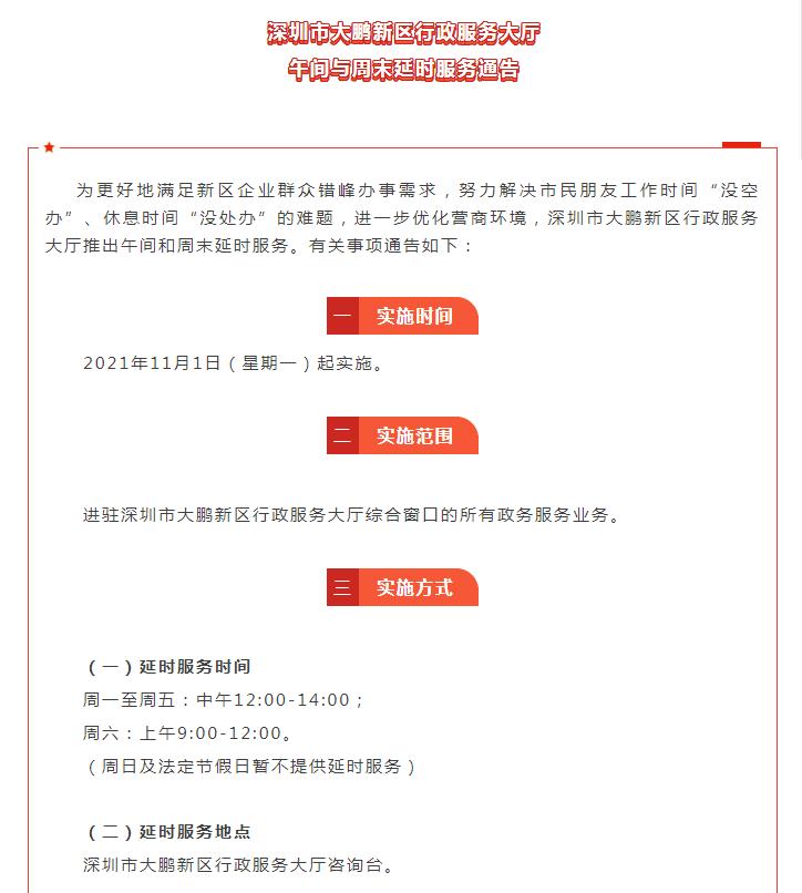 民有所呼,我有所为。为更好地满足企业群众错峰办事需求,优化营商环境,新区行政服务大厅在午间延时服务(工作日12:00-14:00)的基础上,通过优化安排工作时间、错峰安排服务窗口、完善保障机制等方式,进一步推出周末延时服务(每周六上午9:00-12:00),更好地适应不同人群的个性化要求,切实解决企业群众工作时间“没空办”、休息时间“没处办”难题,让企业群众享受贴心便利的政务服务。