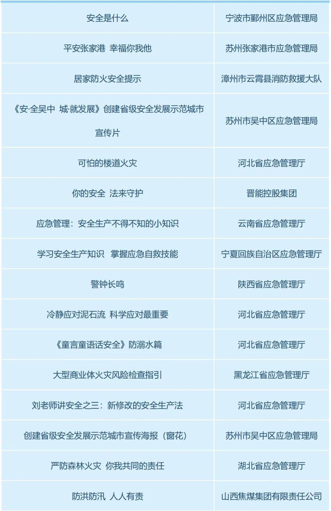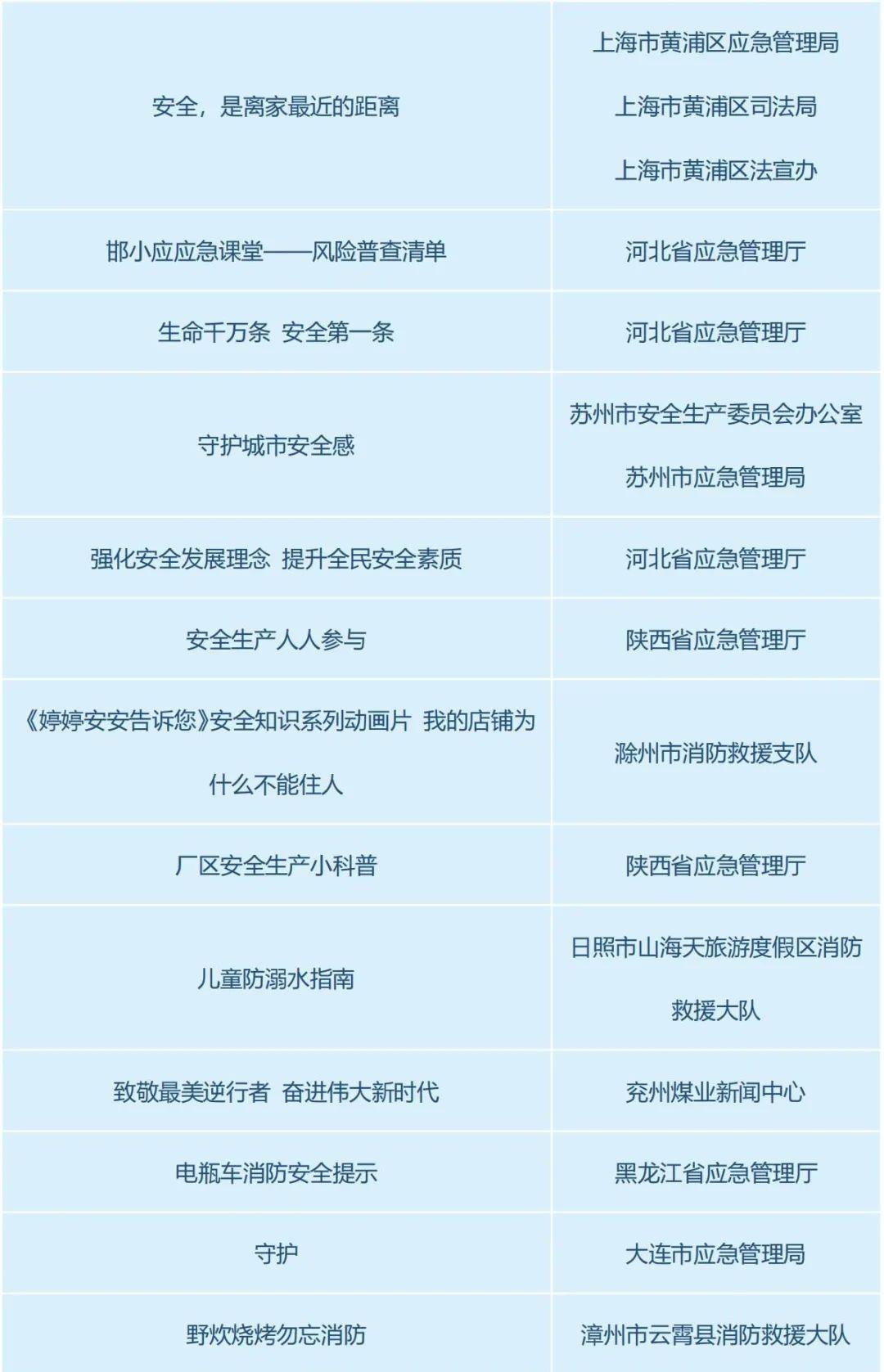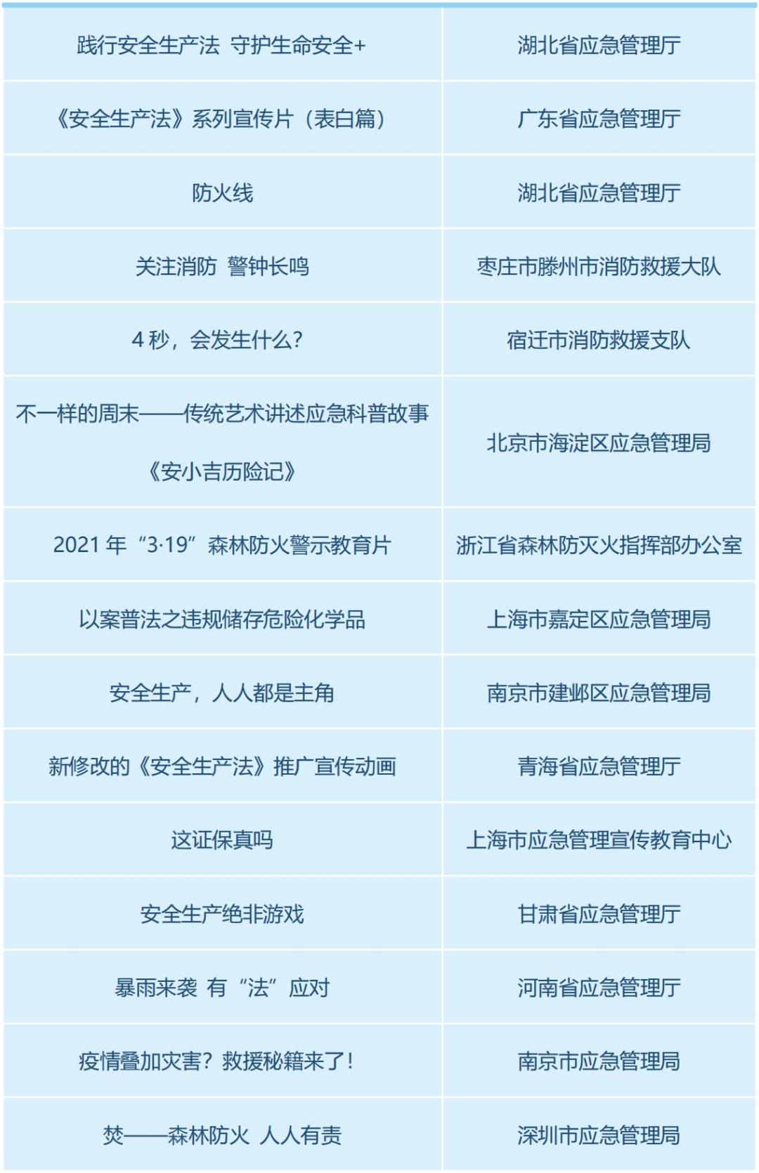 经专家初评、复评、定评,《践行安全生产法 守护生命安全》等15部作品获一等奖,《应急E课堂动画视频 台风》等25部作品获二等奖,《百变应急人》等35部作品获三等奖,《安全是什么》等18部作品获优秀奖(名单见附件1)。江苏省应急管理厅等20个单位获优秀组织奖(名单见附件2)。现将获奖名单予以公布,一、二、三等奖获奖作品将在主办方政府网站和微信公众号展播,供各地区各部门免费使用。希望各获奖单位再接再厉,认真总结经验,在今后应急管理普法工作中再创作出更加优秀的作品。