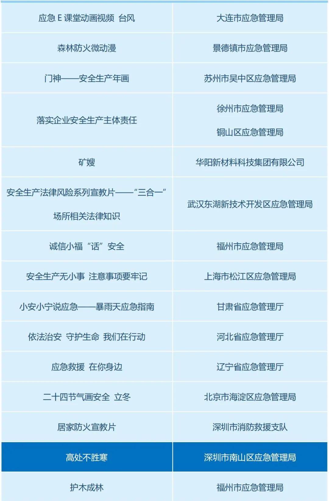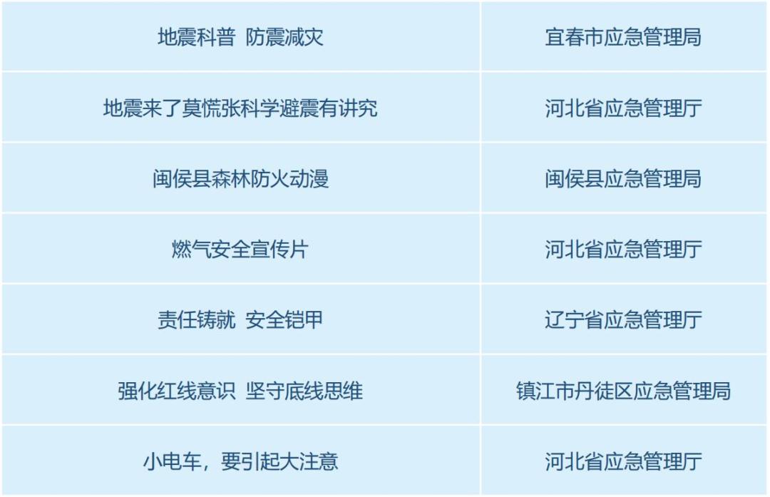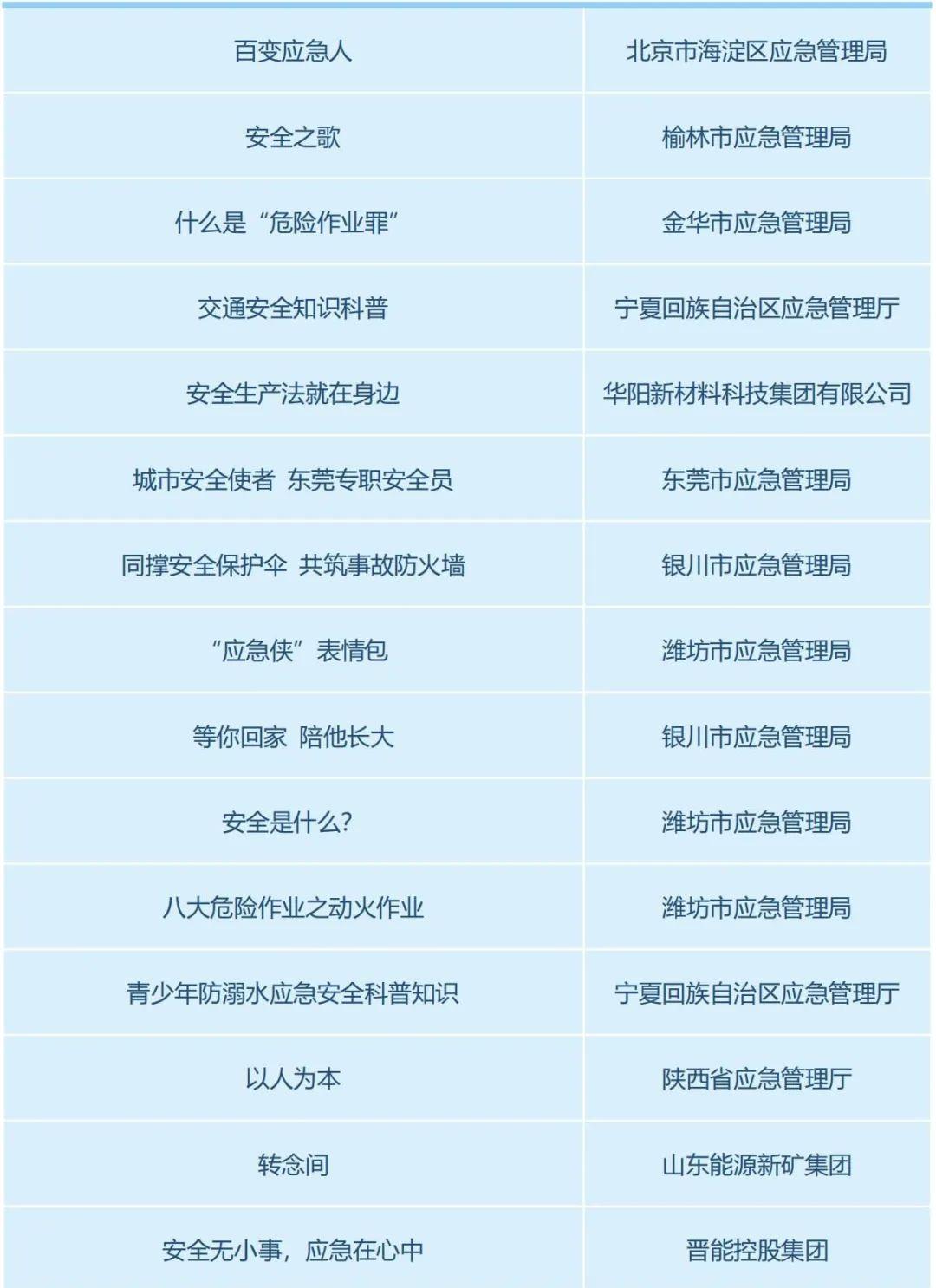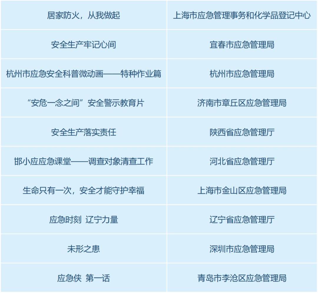 经专家初评、复评、定评,《践行安全生产法 守护生命安全》等15部作品获一等奖,《应急E课堂动画视频 台风》等25部作品获二等奖,《百变应急人》等35部作品获三等奖,《安全是什么》等18部作品获优秀奖(名单见附件1)。江苏省应急管理厅等20个单位获优秀组织奖(名单见附件2)。现将获奖名单予以公布,一、二、三等奖获奖作品将在主办方政府网站和微信公众号展播,供各地区各部门免费使用。希望各获奖单位再接再厉,认真总结经验,在今后应急管理普法工作中再创作出更加优秀的作品。
