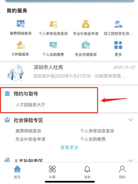 如确需人才园服务大厅现场办理,请提前预约。登录“深圳人社”微信订阅号、“i深圳”APP的人社服务专区,点击:“办事”—“掌上办事”—“人才园服务大厅预约与取号”—“我要预约”。
