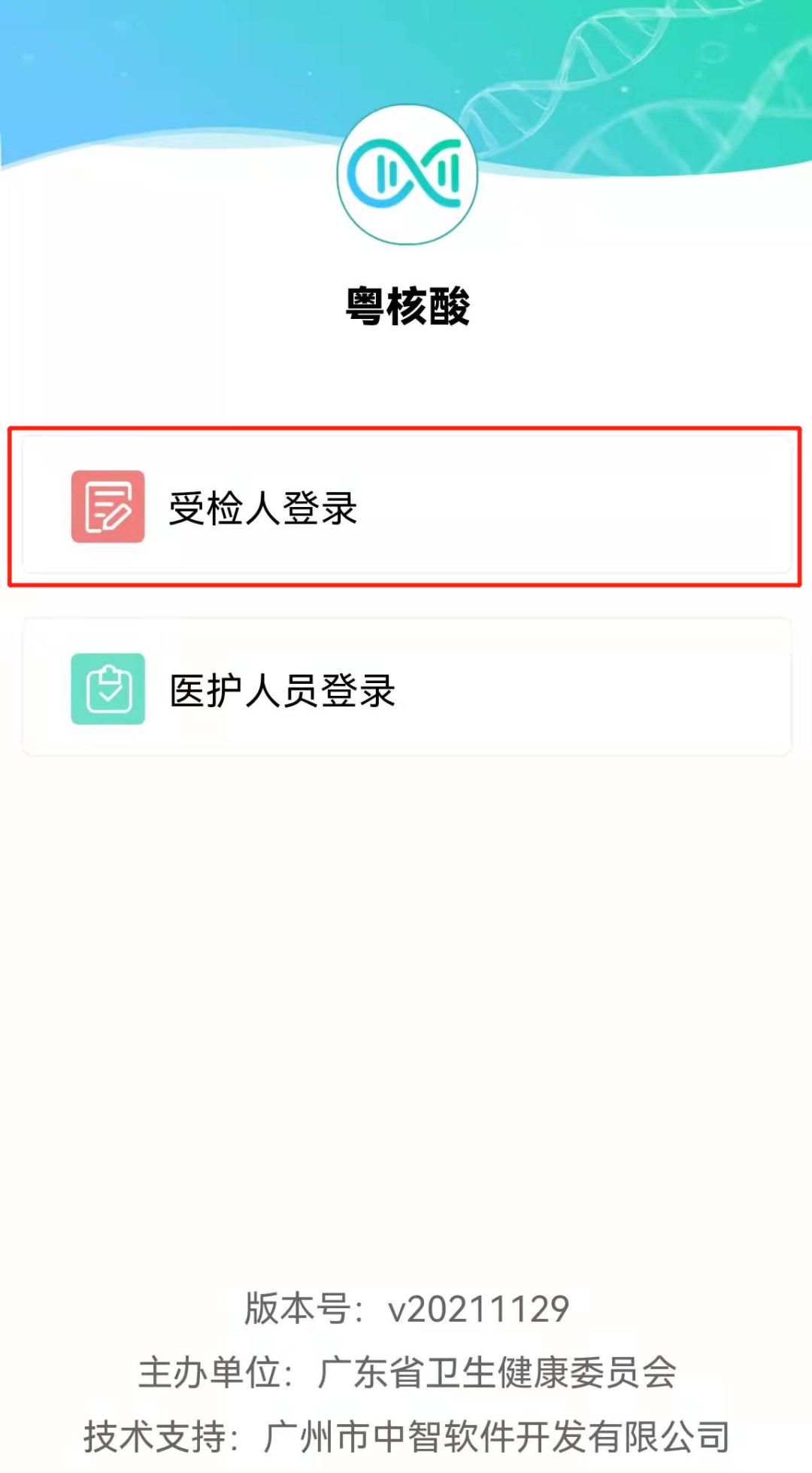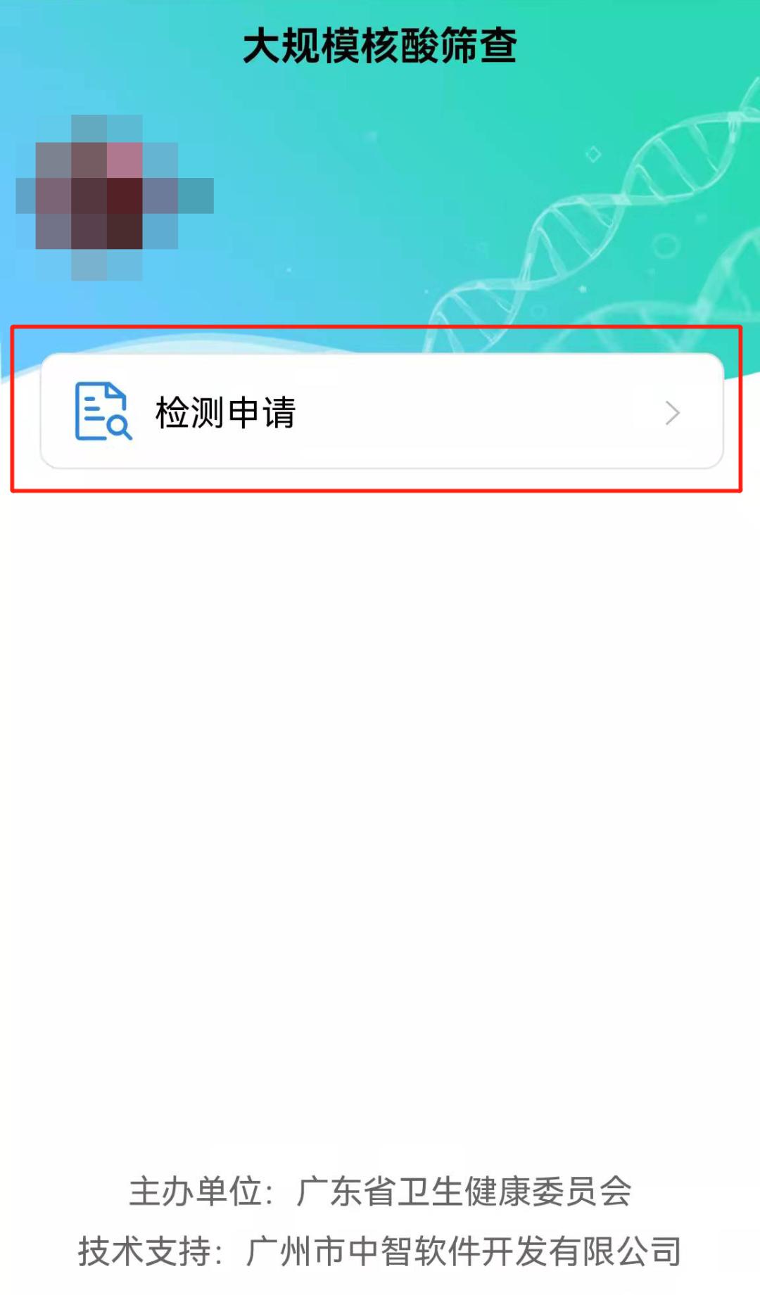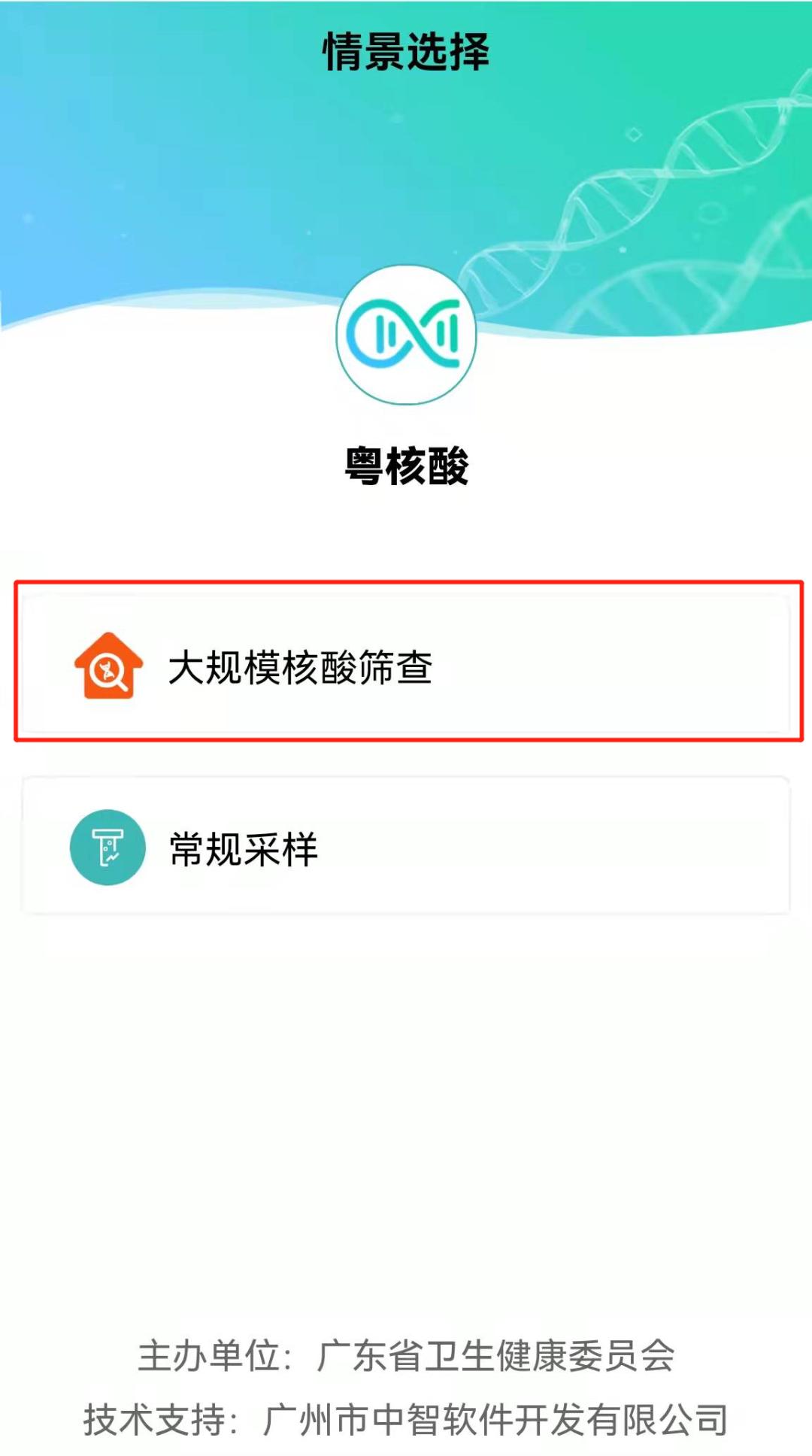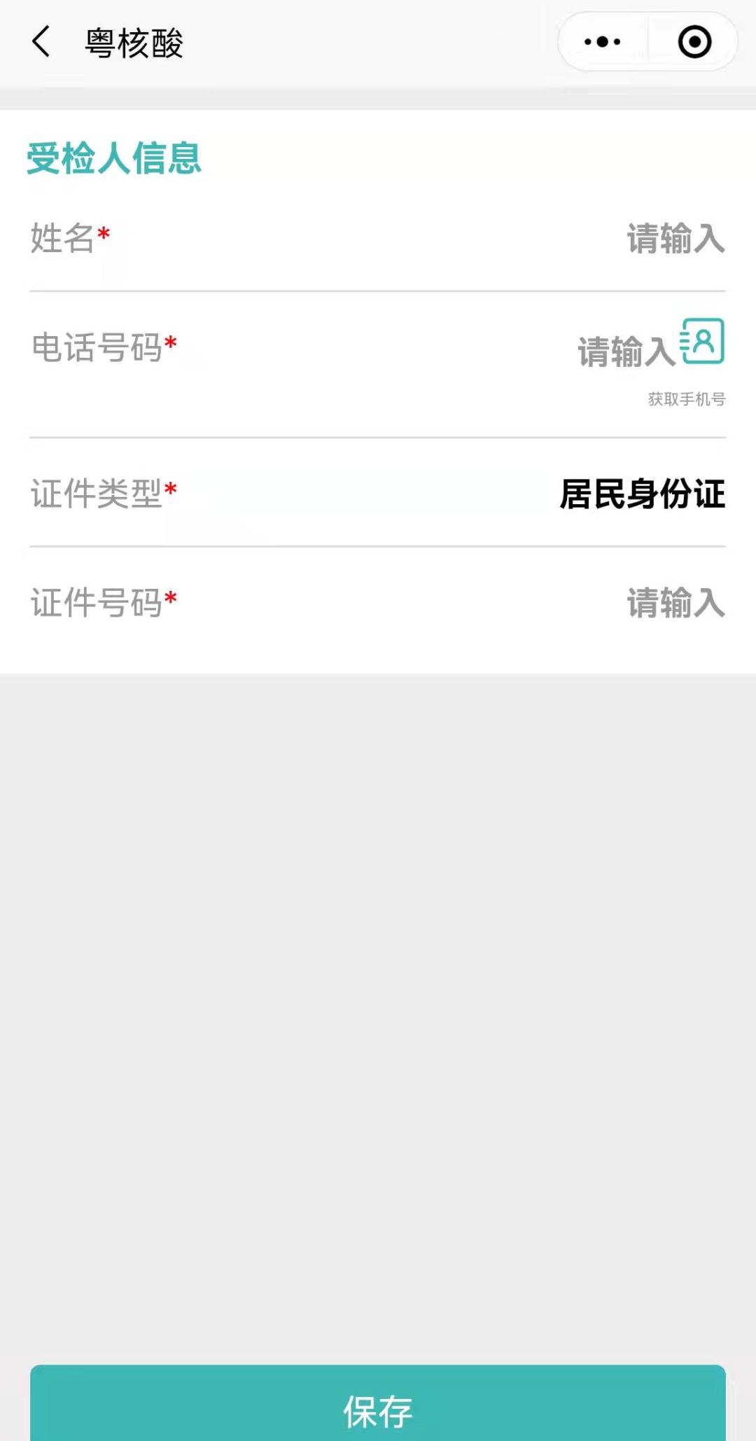 微信扫(识别)“粤核酸”码,进入“粤核酸”系统→点击【受检人登陆】→点击【大规模核酸筛查】→点击【检测申请】→填写个人信息→【截图保存】生成的粤核酸二维码。