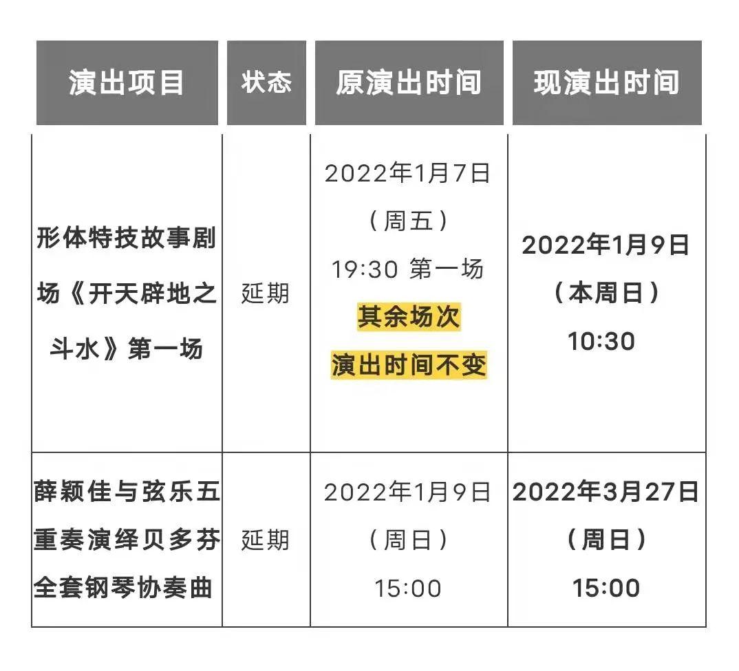● 关于《开天辟地之斗水》、薛颖佳与弦乐五重奏音乐会演出延期的公告。 ☞
