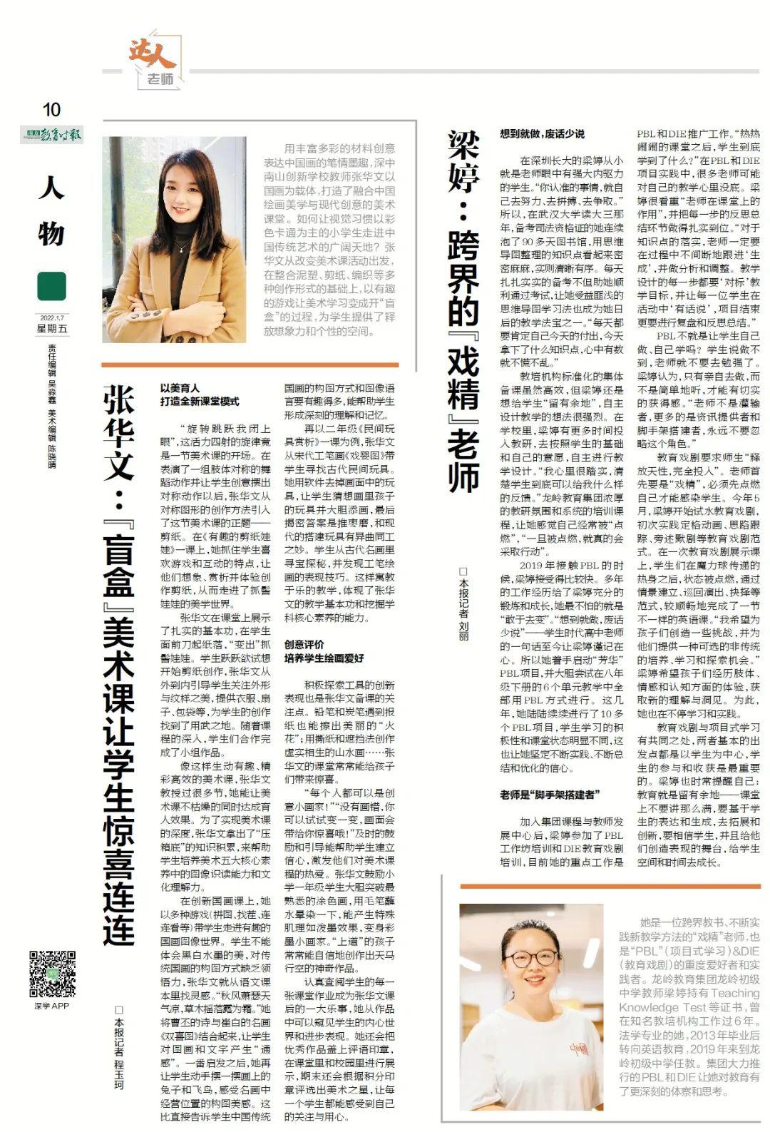 用丰富多彩的材料创意表达中国画的笔情墨趣,深中南山创新学校教师张华文以国画为载体,打造了融合中国绘画美学与现代创意的美术课堂。如何让视觉习惯以彩色卡通为主的小学生走进中国传统艺术的广阔天地?张华文从改变美术课活动出发,在整合泥塑、剪纸、编织等多种创作形式的基础上,以有趣的游戏让美术学习变成开“盲盒”的过程,为学生提供了释放想象力和个性的空间。