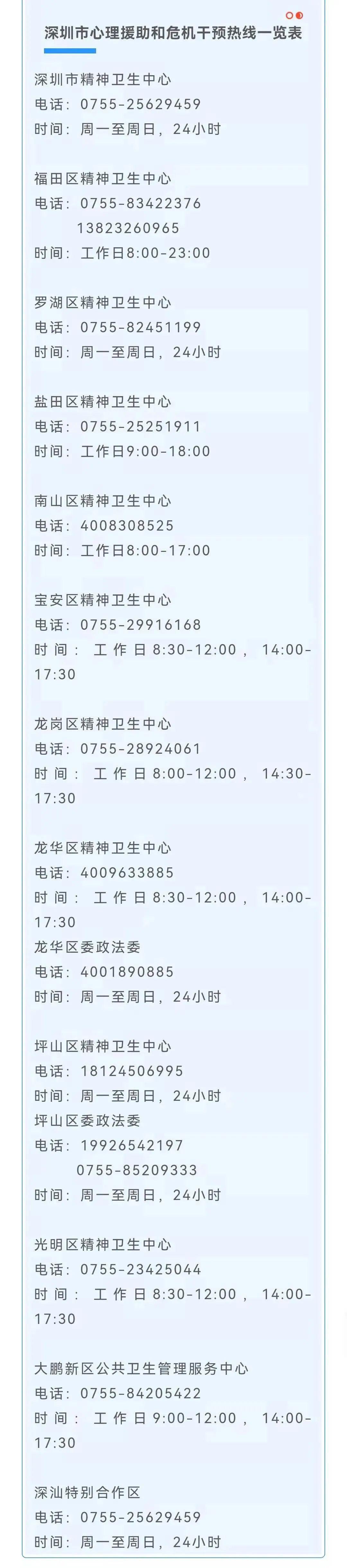 除了隔离点,深圳市在全市公布了心理援助热线电子地图,让市民足不出户、一键拨打“安心热线”,即可获得专业心理辅导。