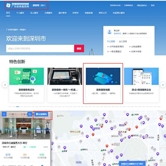 方式五:电脑登录“广东政务服务网深圳站”,点击“政务服务地图”,通过“政务服务地图”找到相应大厅后在右上角点击“在线预约”。