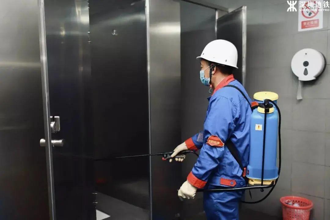 针对卫生间地面、墙面每四小时至少清洁消毒一次,使用有效含氯量为2000mg/L的消毒剂进行喷洒消毒;针对门把手、水龙头开关、洗手台等每四小时使用有效含氯量为500mg/L的消毒剂进行擦拭一遍。深圳地铁还在全网公共区域和洗手间增配了消毒洗手液供市民乘客使用,并定期检查余量确保及时更换。