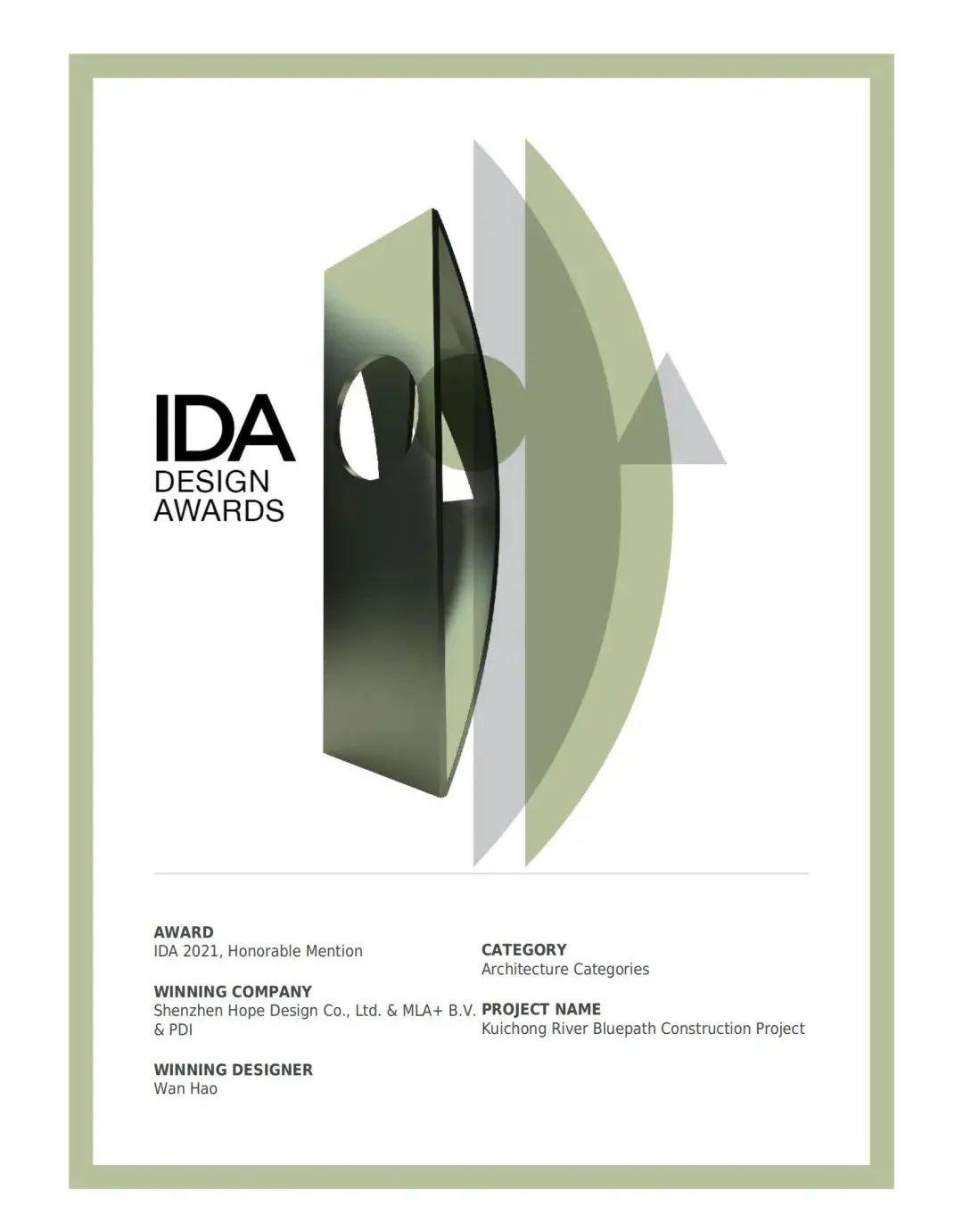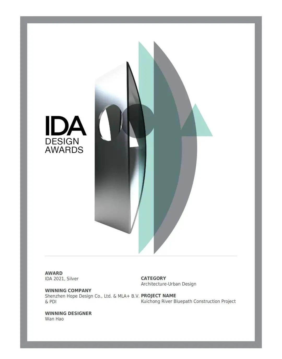 1月7日,美国IDA国际设计大奖(International Design Awards,简称IDA)公布2021年度获奖名单,由新区建筑工务署负责实施,深圳翰博设计股份有限公司、MLA+ B.V.、中交水运规划设计院有限公司联合体设计的葵涌河流域碧道建设工程从全球八十多个国家的数千个项目中脱颖而出,斩获2021美国IDA国际设计大奖/城市设计类银奖和设计大奖/景观类荣誉奖!