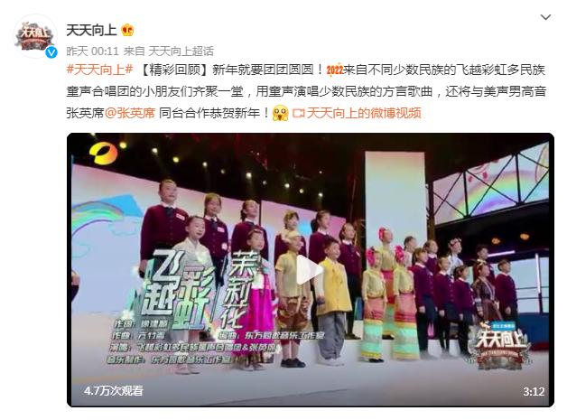 近日,福田区飞越彩虹民族童声合唱团亮相湖南卫视《天天向上》新年节目——“青春唱响2022”,由各民族孩子组成的合唱团与多位专业艺术家同台献艺,用天籁童声和民族音乐,共同演绎“最美中国故事”,独特的民族服饰和天真可爱的笑容“萌化”了现场观众,成为福田区全面深入持久开展民族团结进步创建工作的一个精彩缩影。