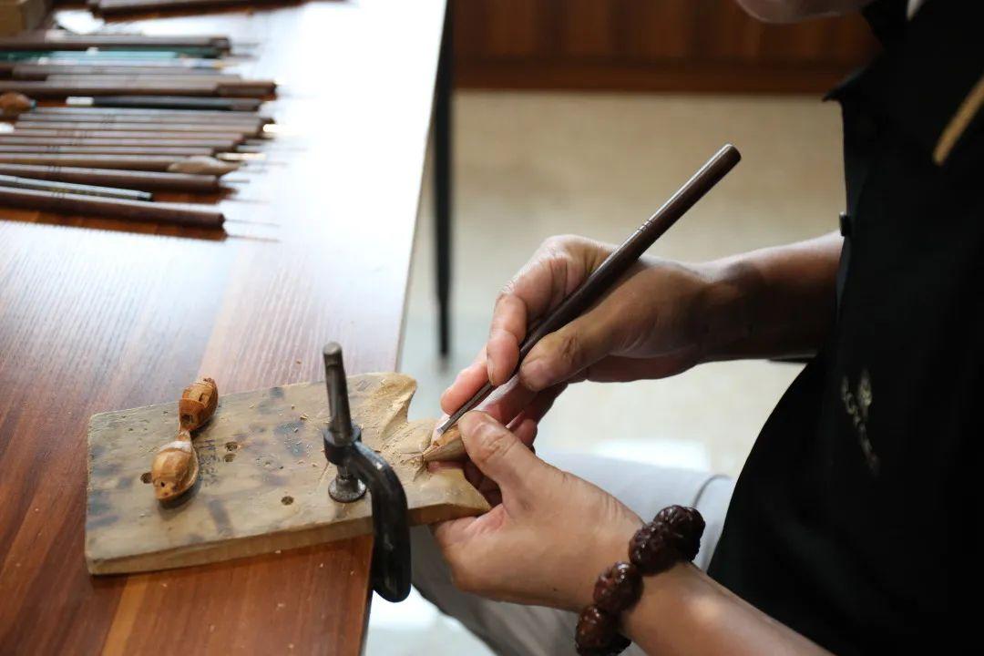 从收料选料到构思、选定题材,再到细节刻画、打磨等程序,一个作品的完成短则几周,长则数月、数年,一件复杂的作品后期还要经过多次修改,一枚小小的榄雕承载着的是雕刻家夜以继日一刀一划的手工创作。