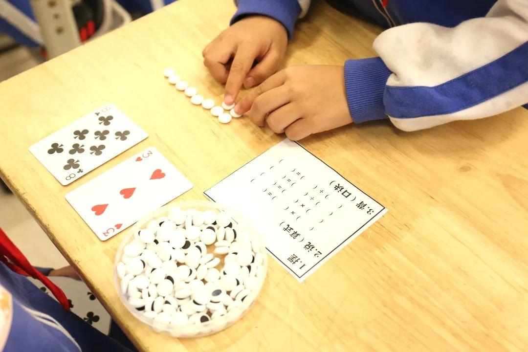“口诀比拼”关卡,只见考官拿出两张扑克数字牌,考生用桌面的物品,摆出这两个数相乘的一种乘法意义,考生要说出相关乘法算式和除法算式各两个,并背出相关联的口诀。“口诀比拼”充分考查了学生的动手操作、乘除法算式的意义及读法的区别、口诀的应用和理解三个方面。