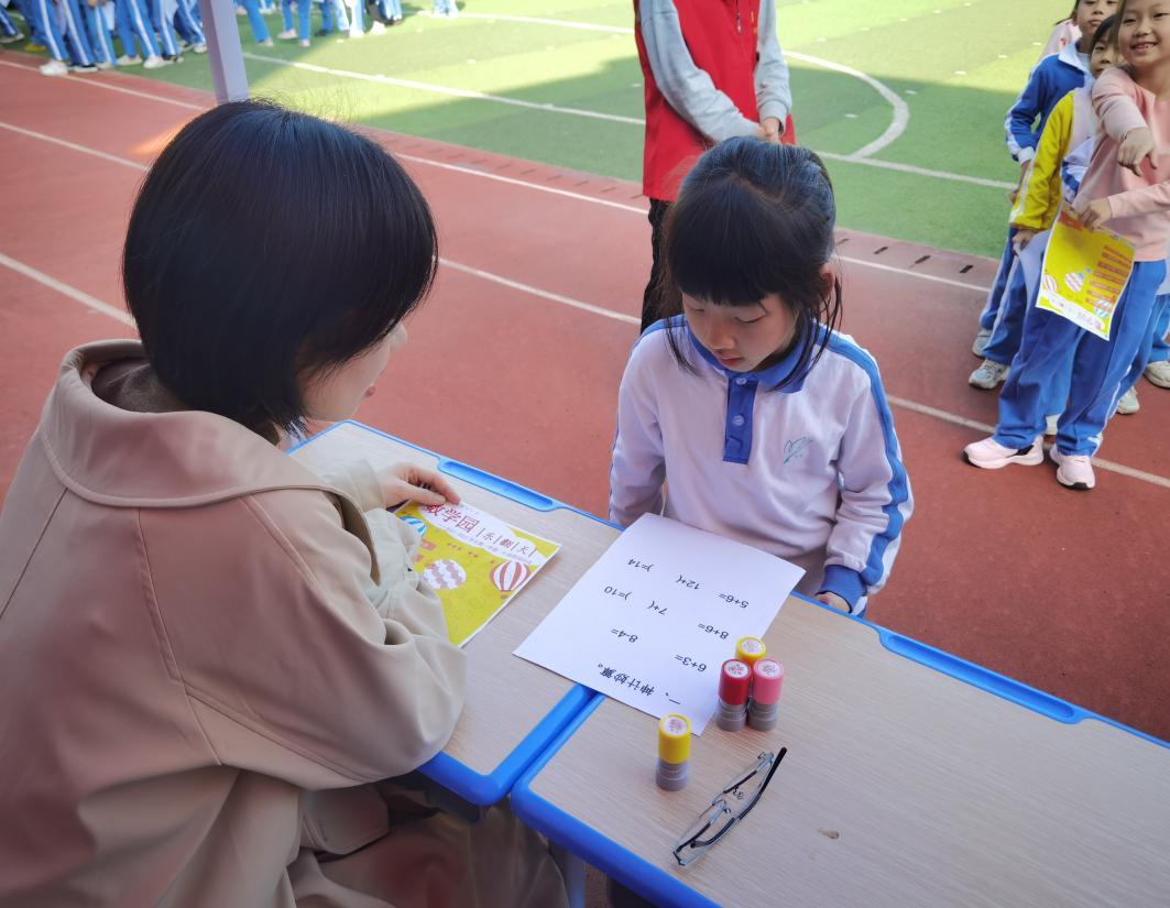 紧接着,孩子们来到了数学王国。根据学生年龄特点及学期知识点,数学游园活动将数学知识融合成若干个综合性游戏项目,设计了富有意义又有趣的关卡如“神计妙算”“秋游小帮手 ” “火眼金睛”“应用小达人”“测量小能手”等,题型多样,趣味十足!