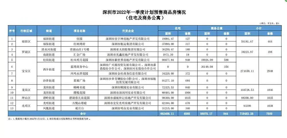 ● 截至1月12日,深圳市2022年一季度计划入市的商品住宅及商务公寓项目13个,预计供应房源面积为71.85万平方米,共7509套。☞