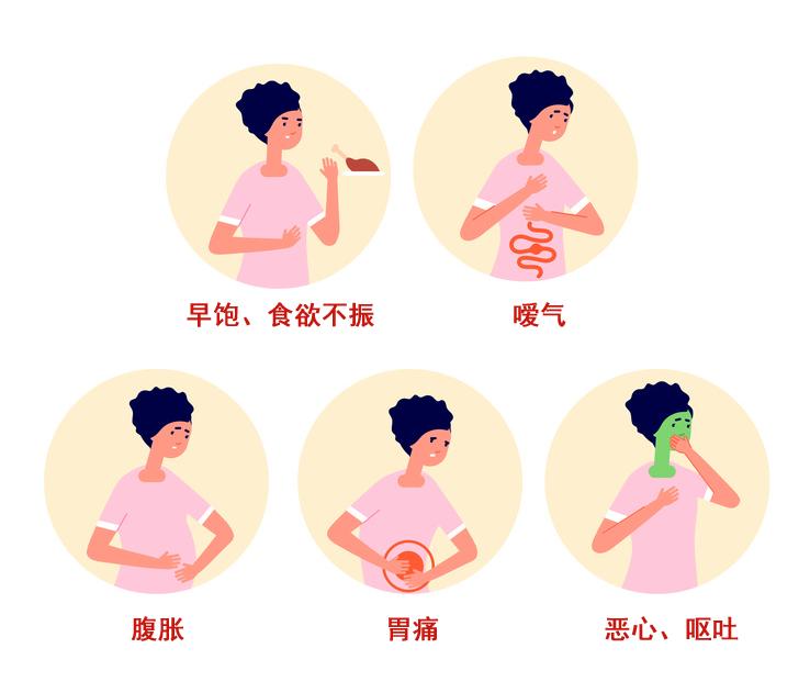 5%~10%患者发生HP相关消化不良,主要表现为腹胀、早饱、嗳气等。