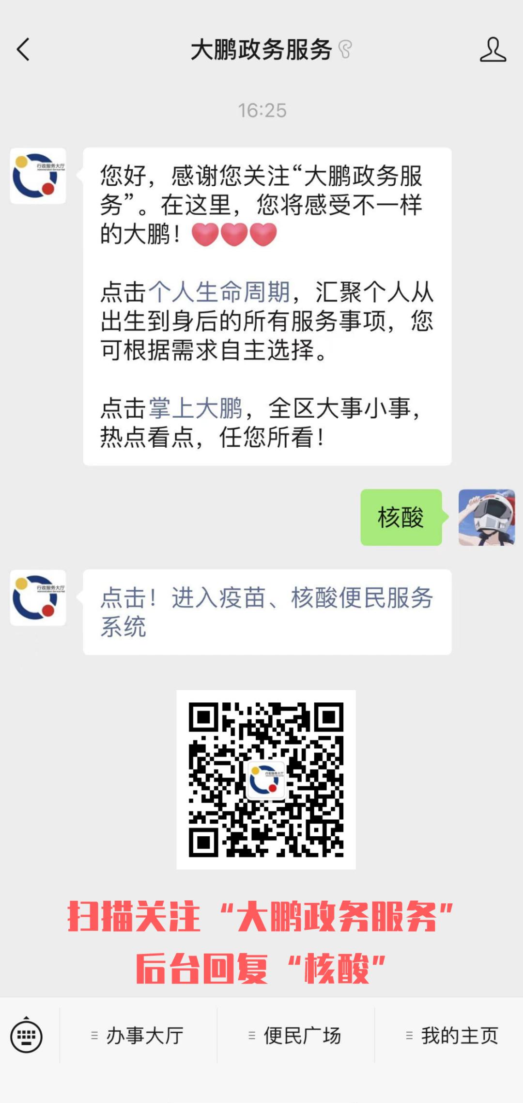 1. 关注“大鹏政务服务”微信公众号,后台回复“24小时核酸”;