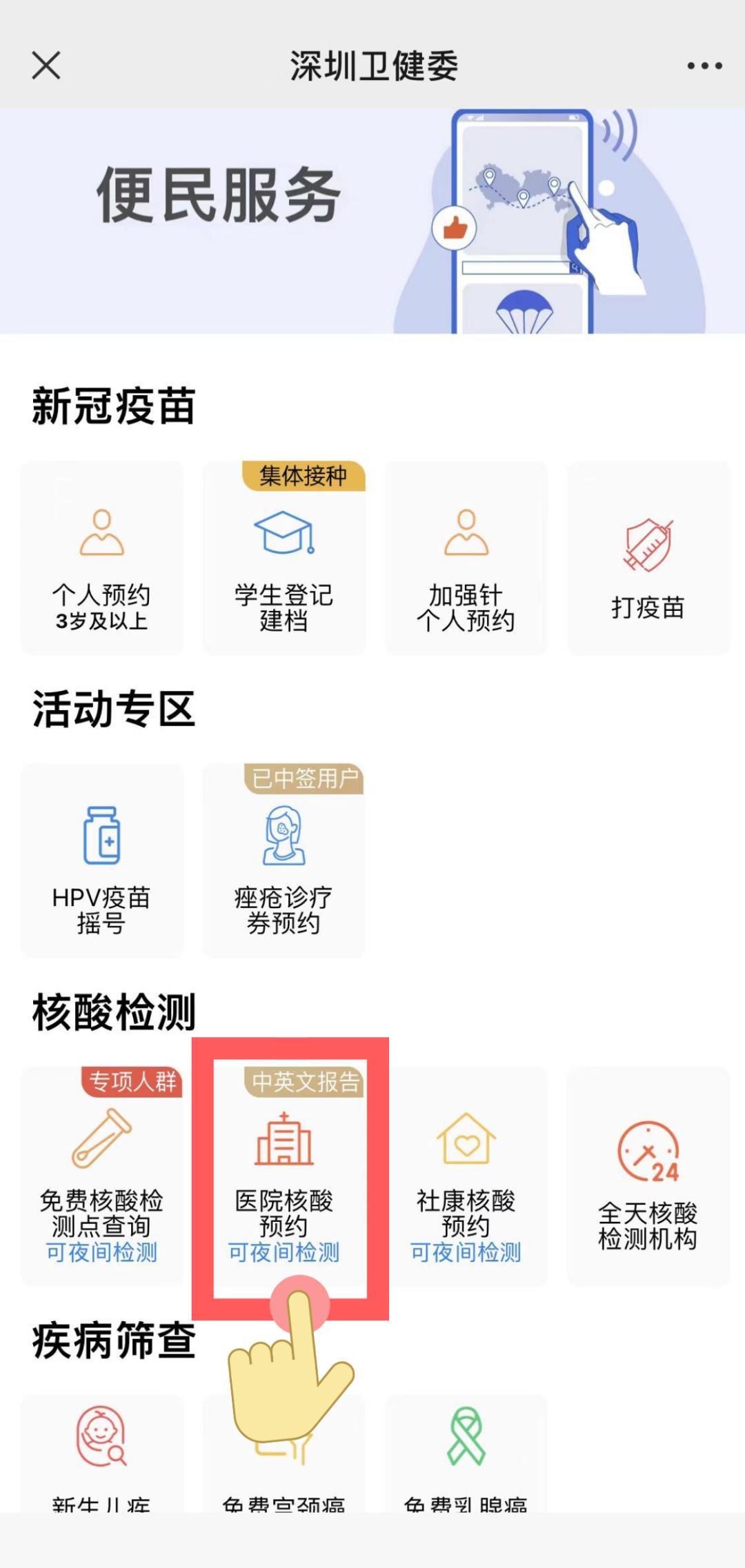 1. 后台回复“核酸”,点击进入便民服务页面,然后点击“医院核酸预约”;