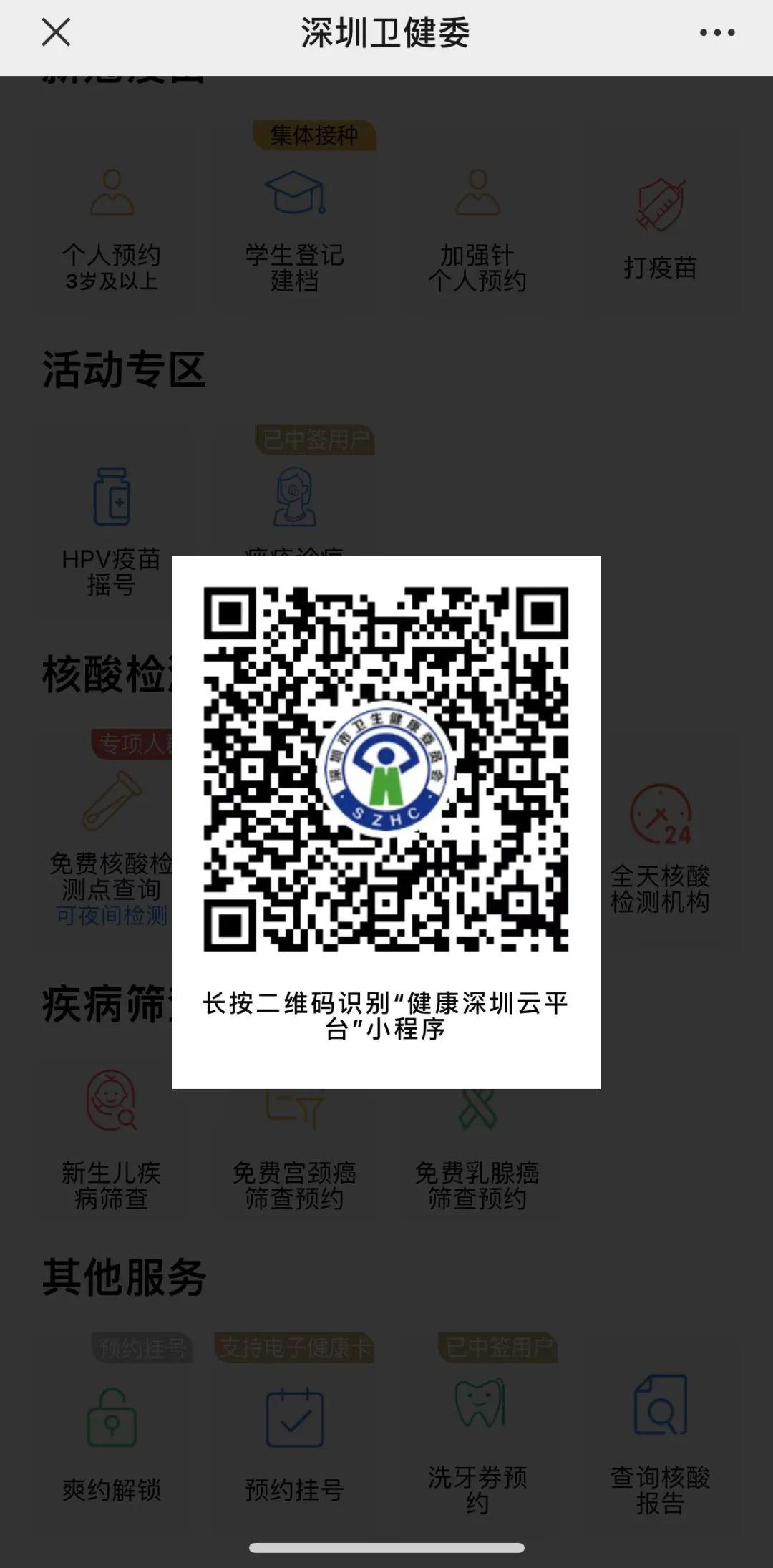 2. 长按二维码进入“健康深圳”小程序,就能看到医院名单,部分医院支持线上预约(留意底下小标签)。
