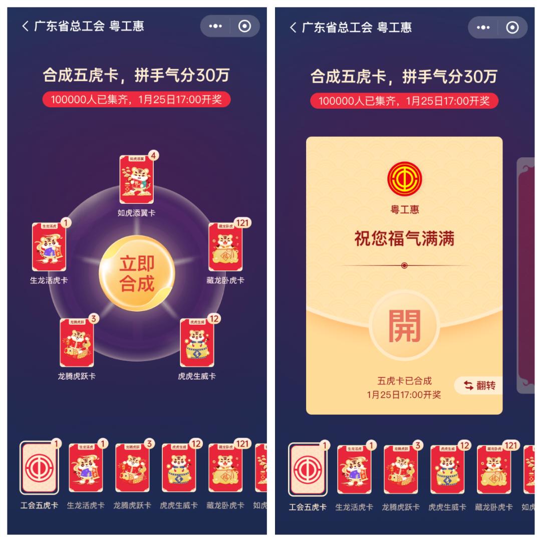 通过公众号、小程序等途径获取虎卡,每张虎卡背后会随机出现各级工会及商家联合送出的福利、粤工惠虎年定制微信红包封面等福利,点击即可领取。