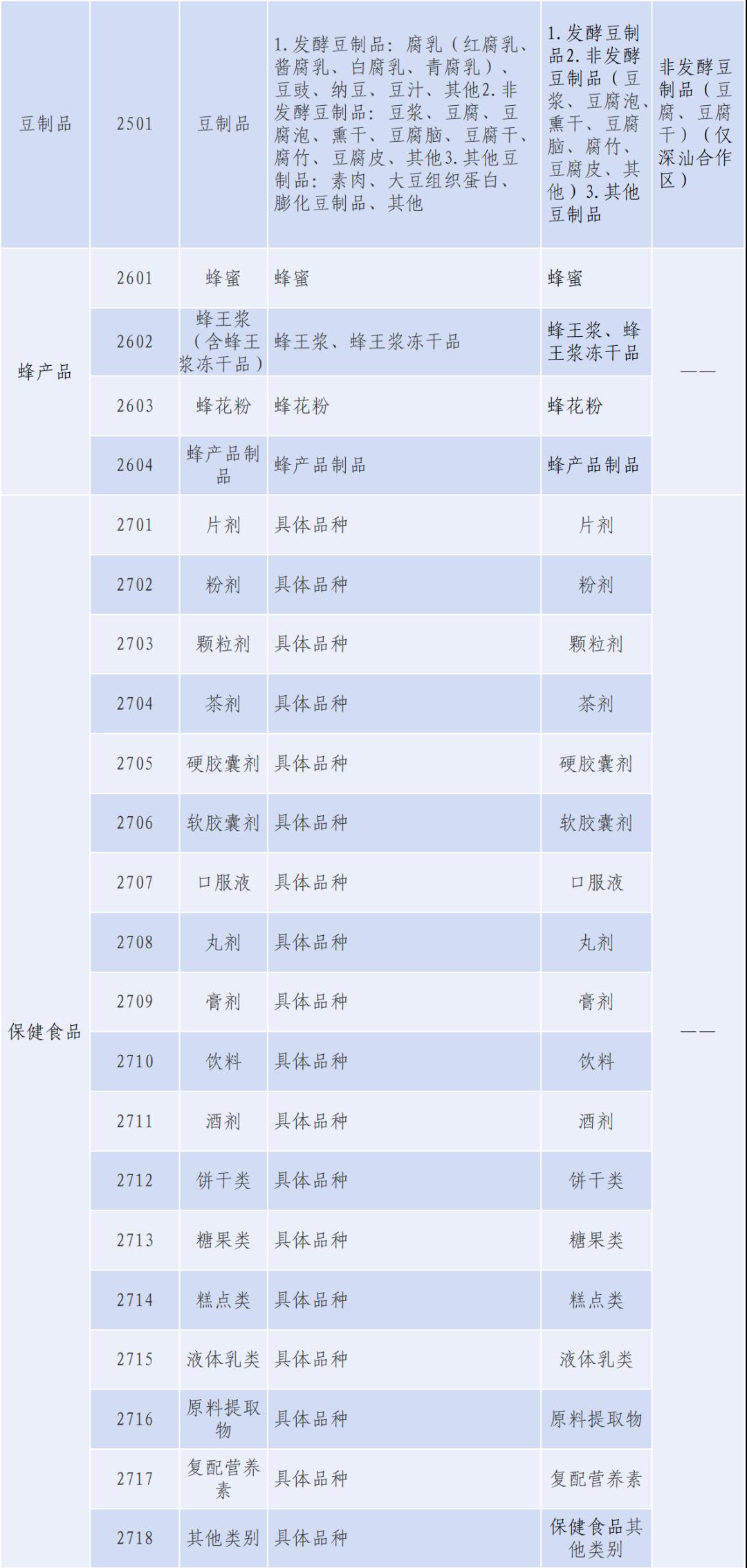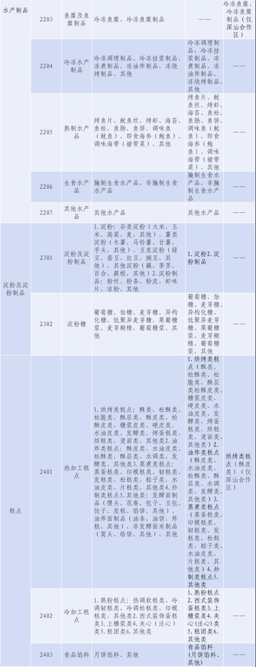 4.新增了限定深汕合作区可申请生产加工的食品品种25种。在考虑到深汕合作区的当地食品生产企业不多,经济发展水平相对落后、地缘因素及当地居民饮食习惯等特殊情况,结合市市场监督管理局工作实际,按照风险可控、弘扬深汕特色传统食品为原则,在深汕合作区范围内新增25个品种。