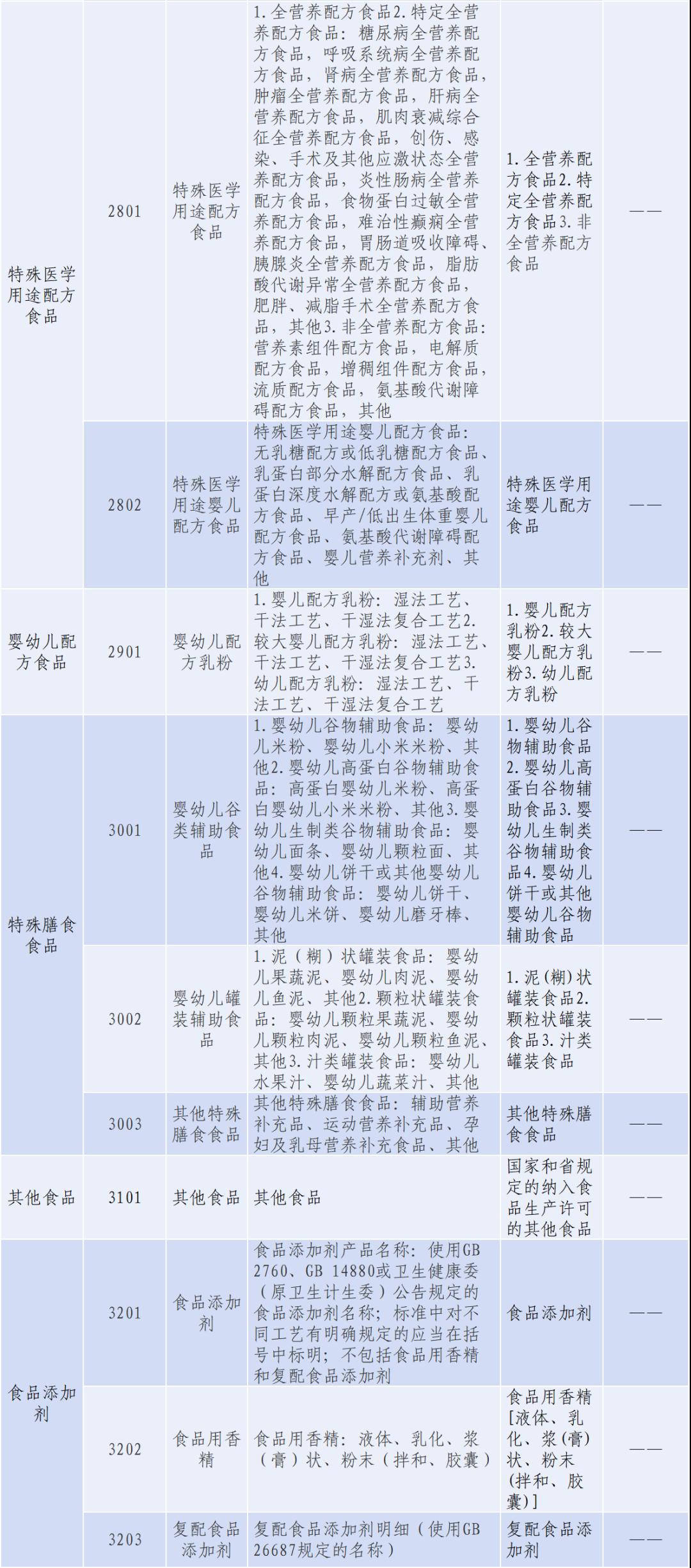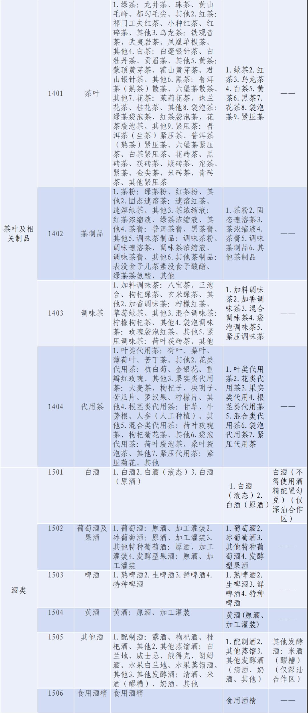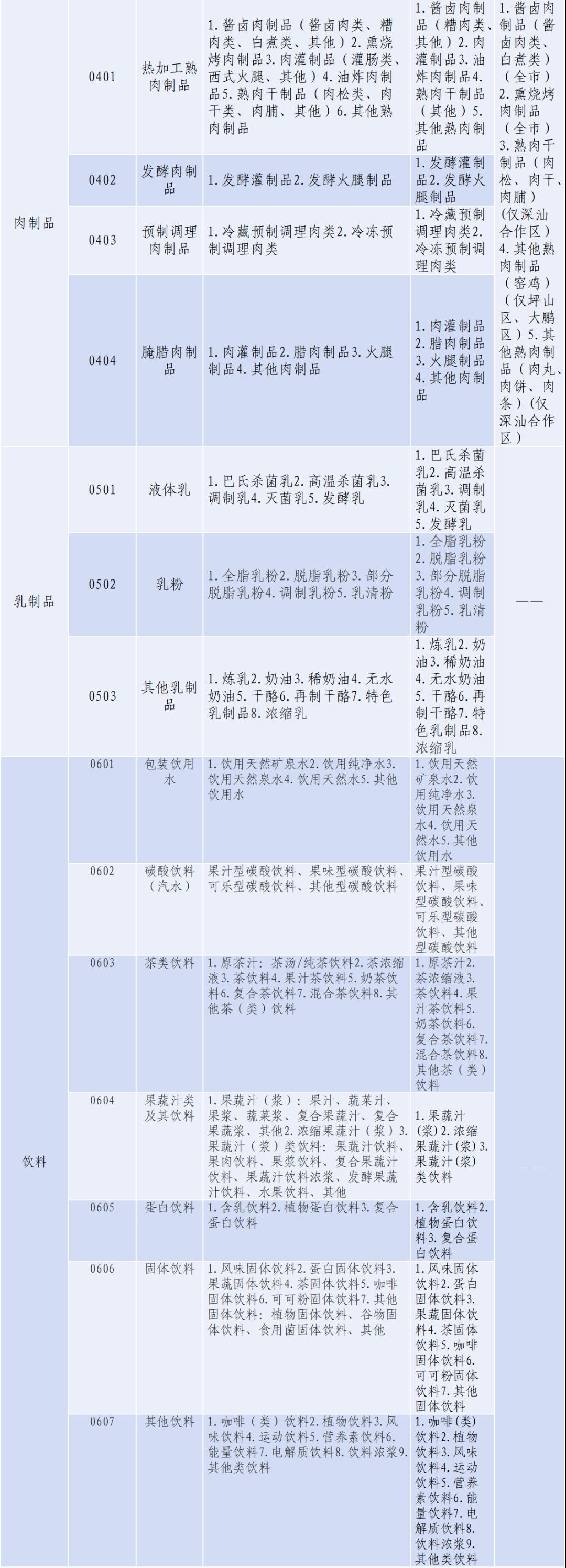 限定宝安区、坪山区、大鹏新区、深汕合作区四个区域可申请生产加工的食品品种28种。包括:
