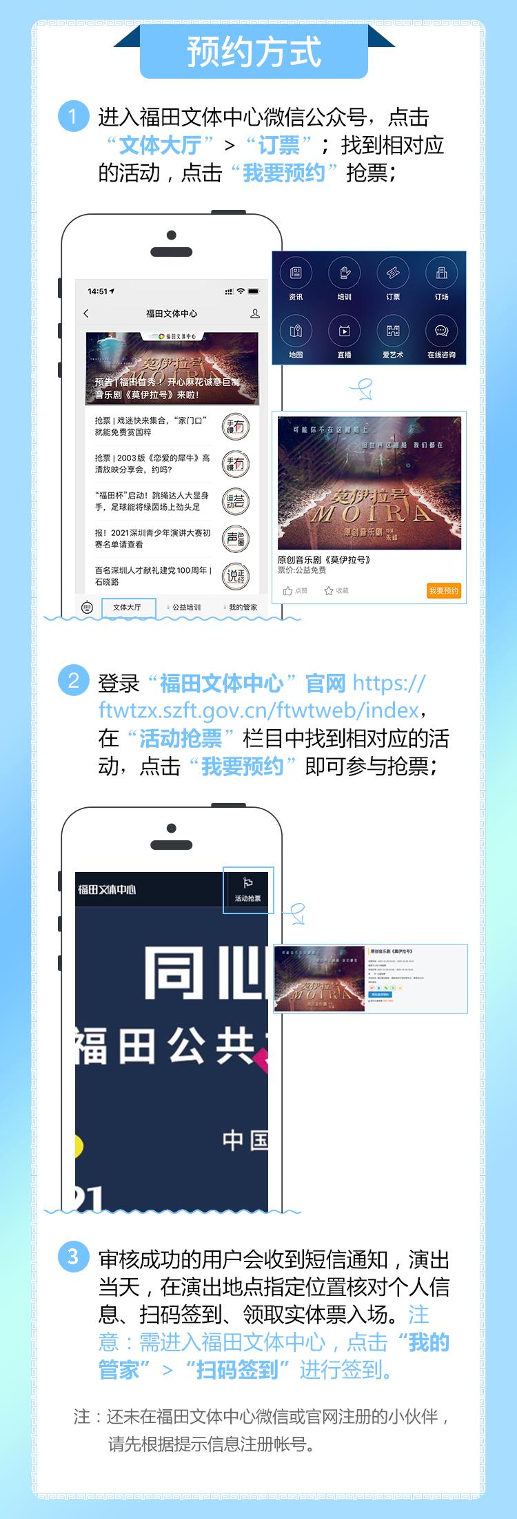 ①网上预约成功后,提前在福田星空剧场门口扫码签到,领取实体票入场。一人一票,对号入座,儿童一律凭票入场。
