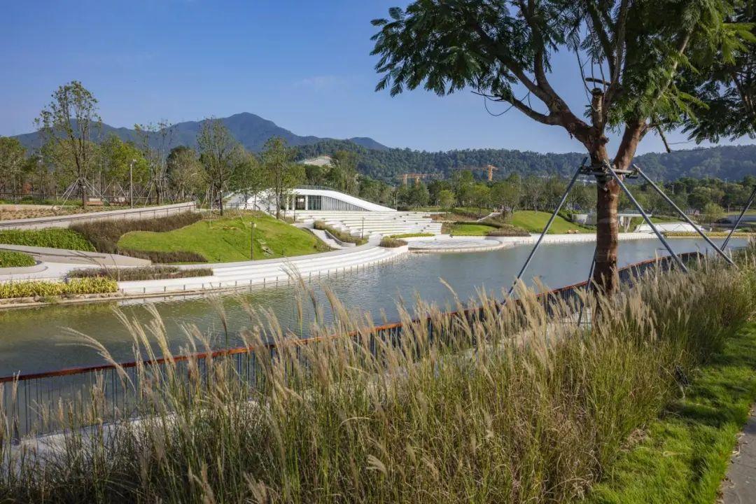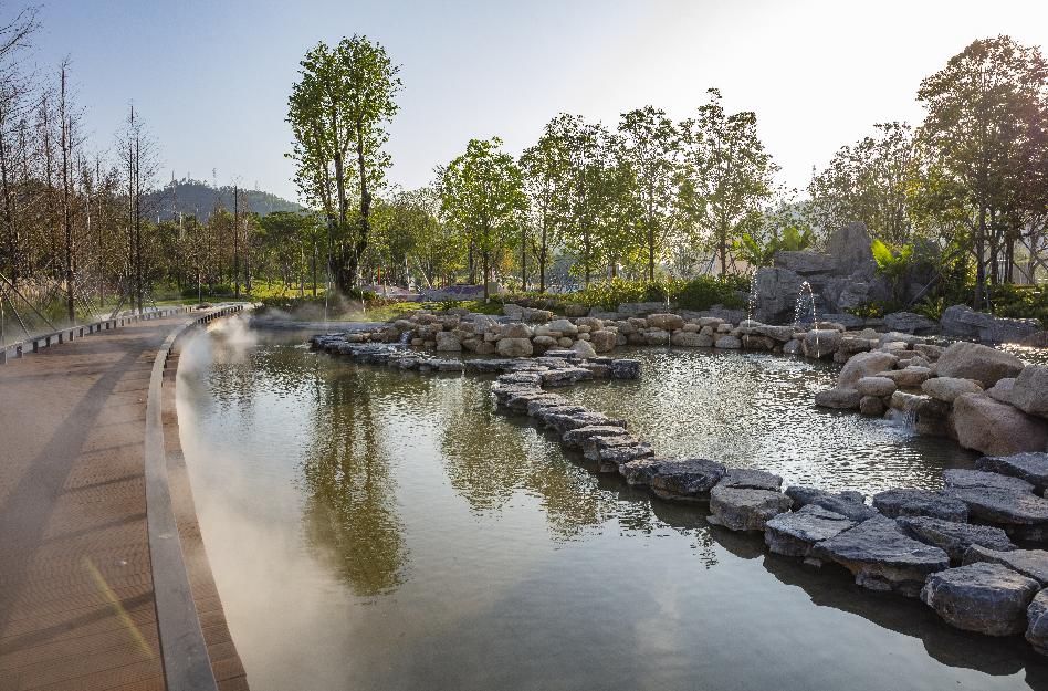 通过跌水、溪流、湿地、雾森、瀑布、索桥、湖区等多种手法,将全段分为城市绿廊核心区、鹏城瀑布景区、滨水香堤区三大段落来塑造水岸景观,打造开合有致、灵动韵律、一路向海的河道景观。