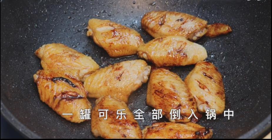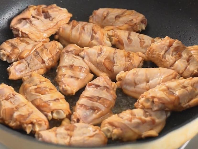 3、腌好的鸡翅不能焯水,直接煎,鸡皮一面朝下,转中小火,盖盖煎3分钟,翻面再煎3分钟。