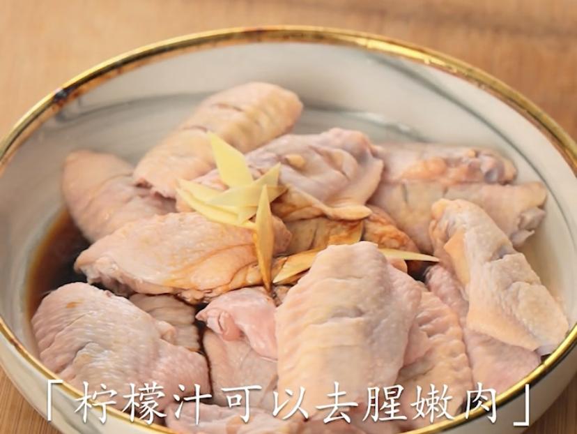 2、泡好的鸡翅,正反面打上花刀,切好后,加入调料:姜片、料酒、生抽、红烧酱油,最后挤入一瓣儿柠檬汁,抓匀腌制15分钟。