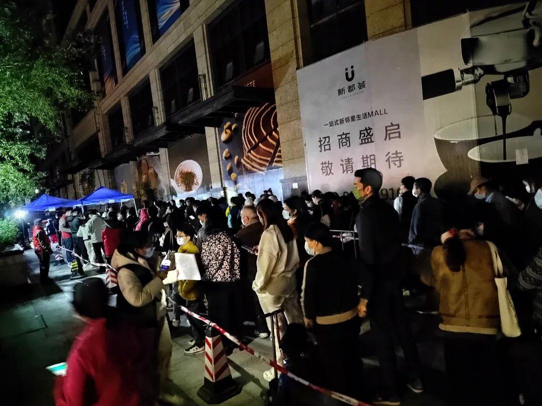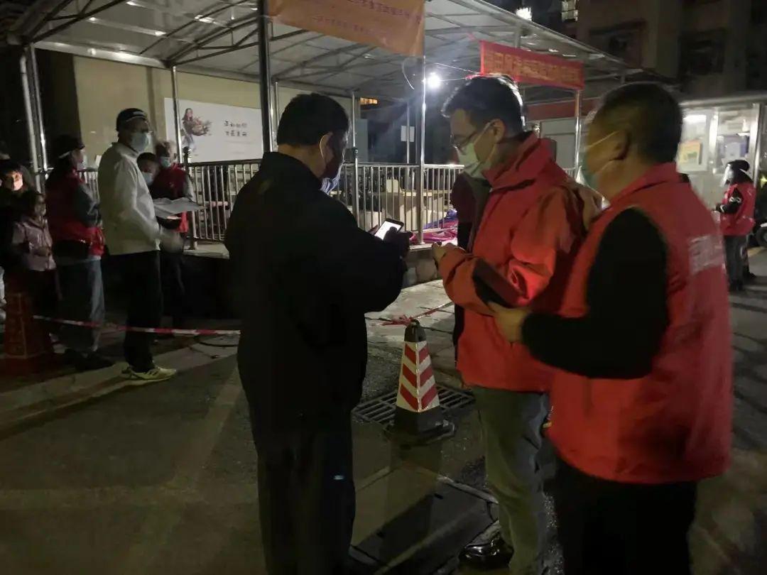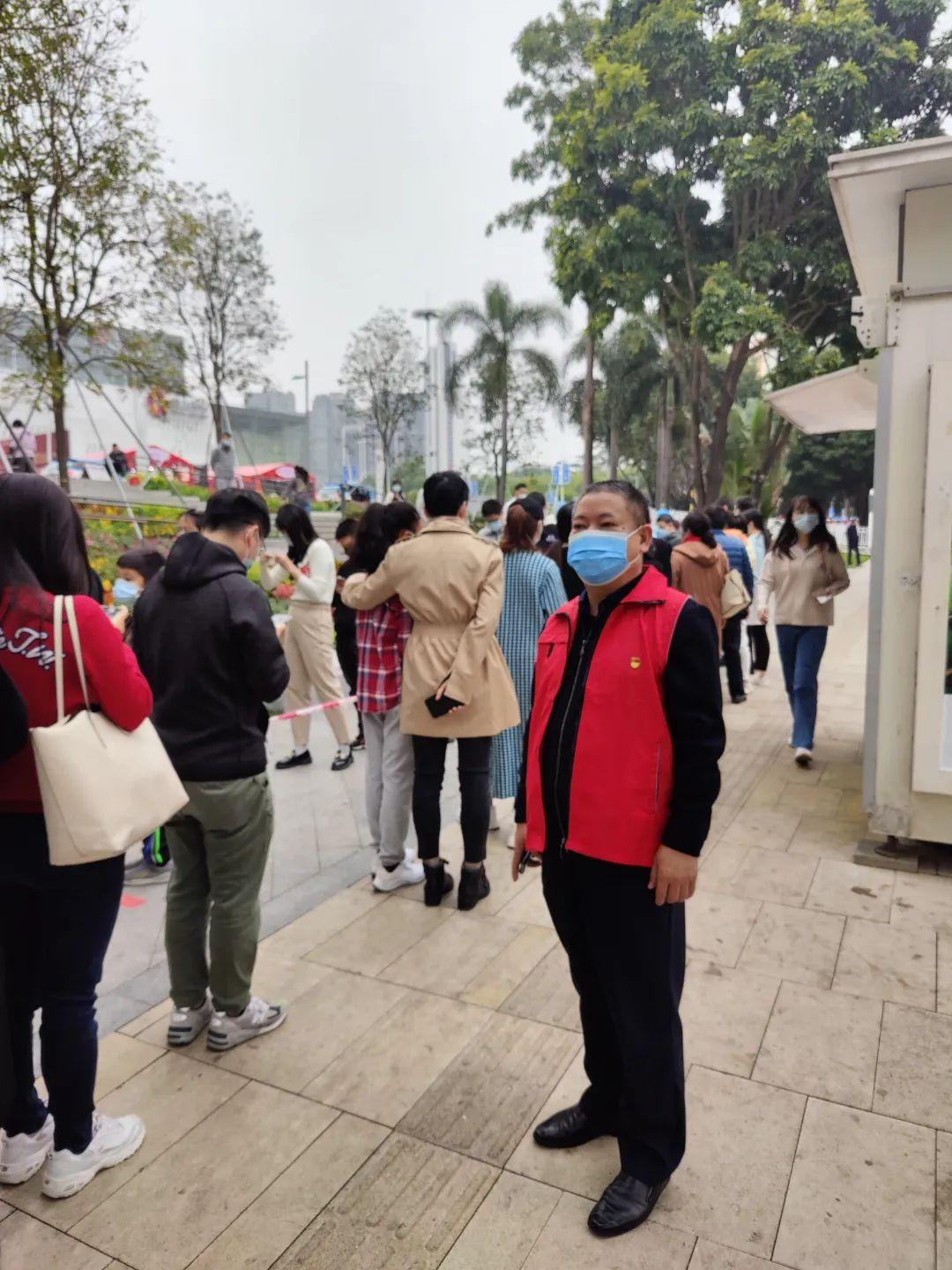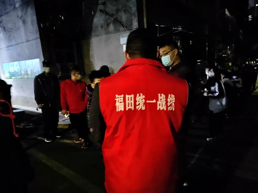 1月11日晚,在香蜜湖街道建业小区、宝能广场、山姆会员店等多个核酸采样点,福田区工商联的志愿者们身着“福田统一战线”的红马甲,有条不紊地协助工作人员做好相关工作,引导居民有序进行核酸采样。