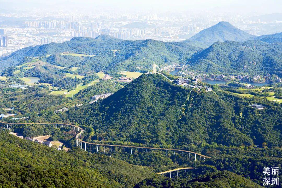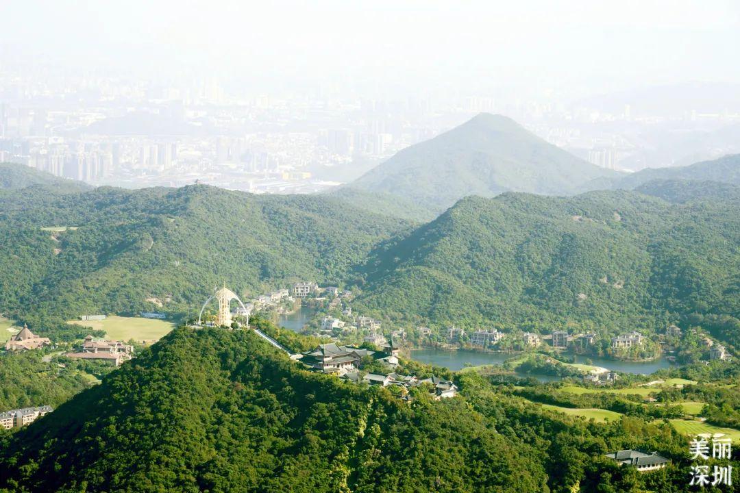 从山顶往下望,可俯瞰到东部华侨城茶溪谷的森林小火车徐徐前行;在山林中蜿蜒曲折的环山公路;隐秘于山林中神秘而神圣的大兴华寺;仿佛置于世外、别样洞天的别墅群。