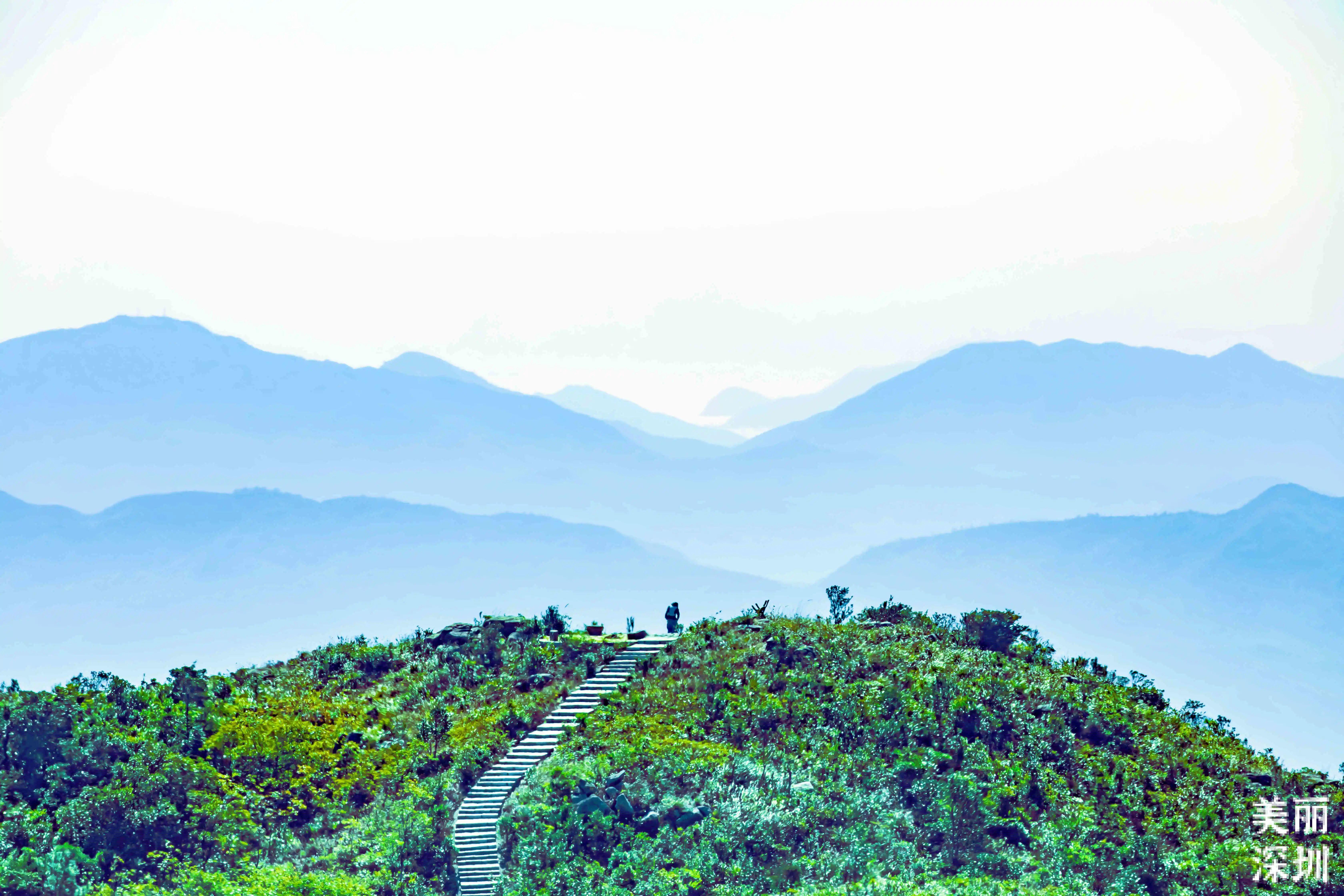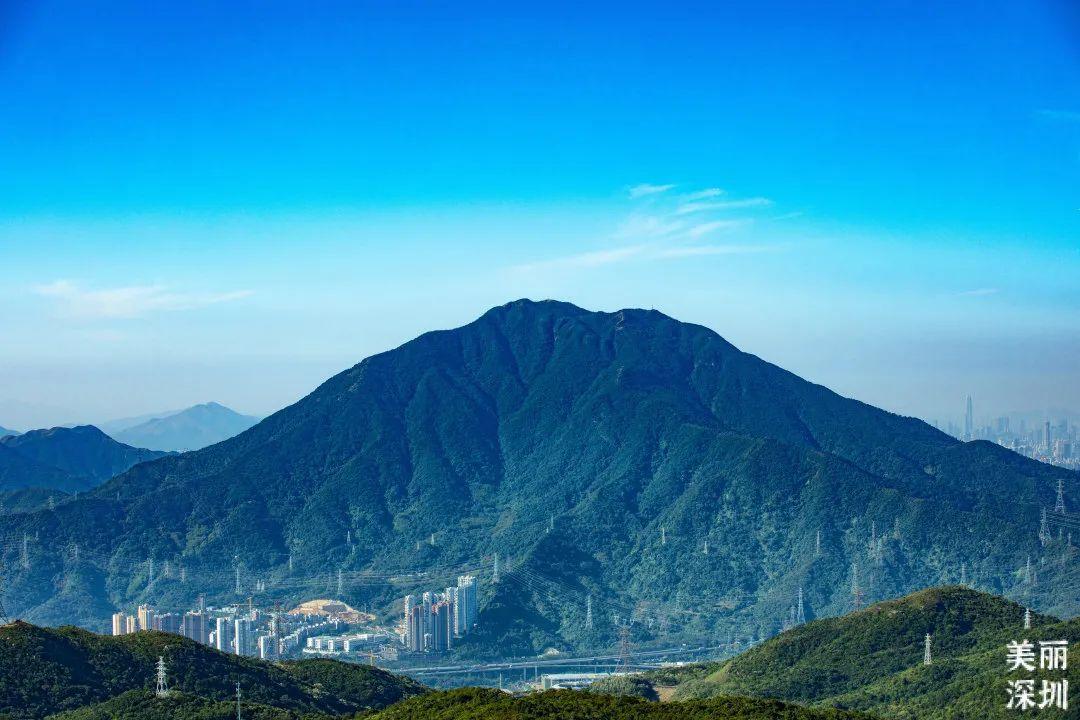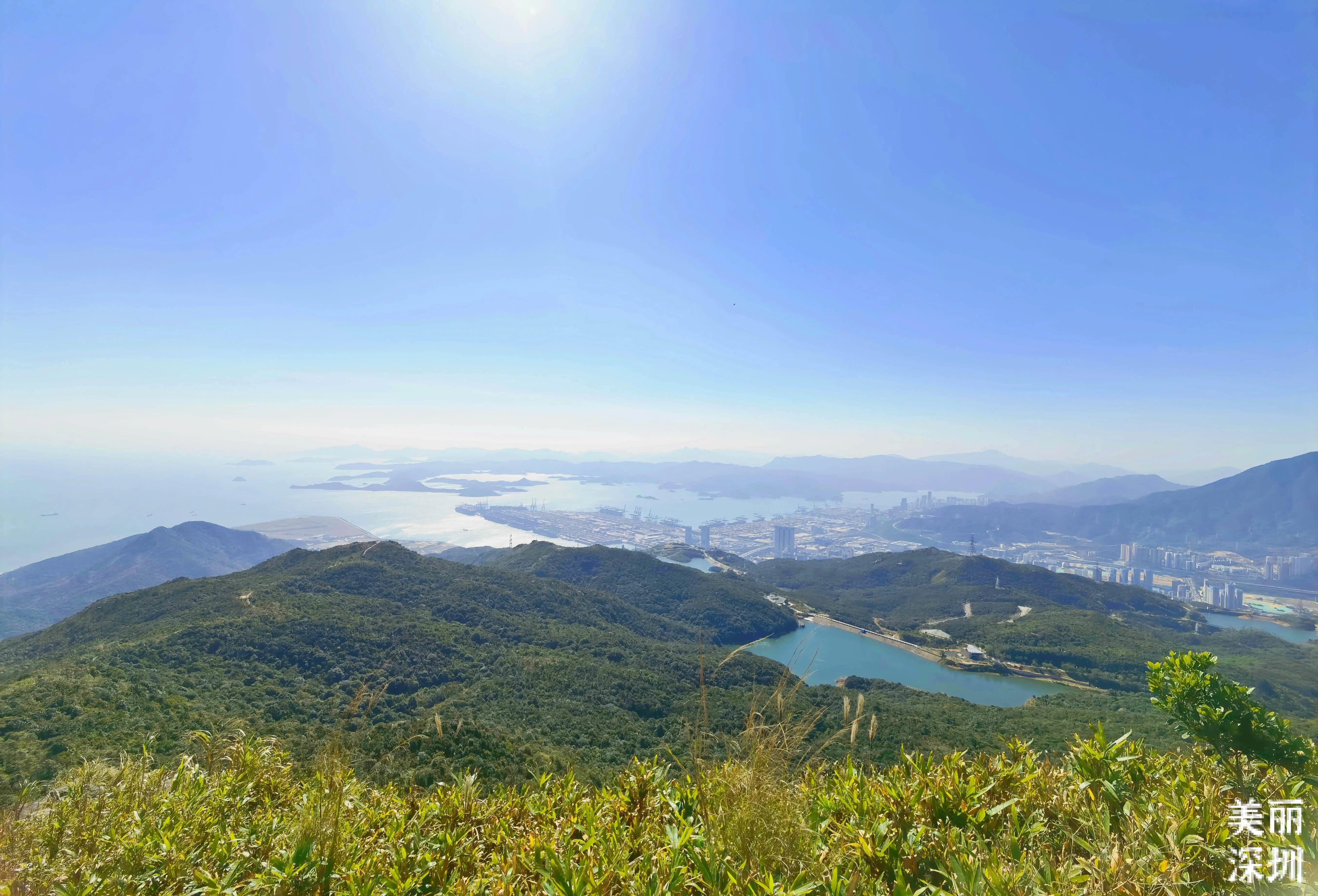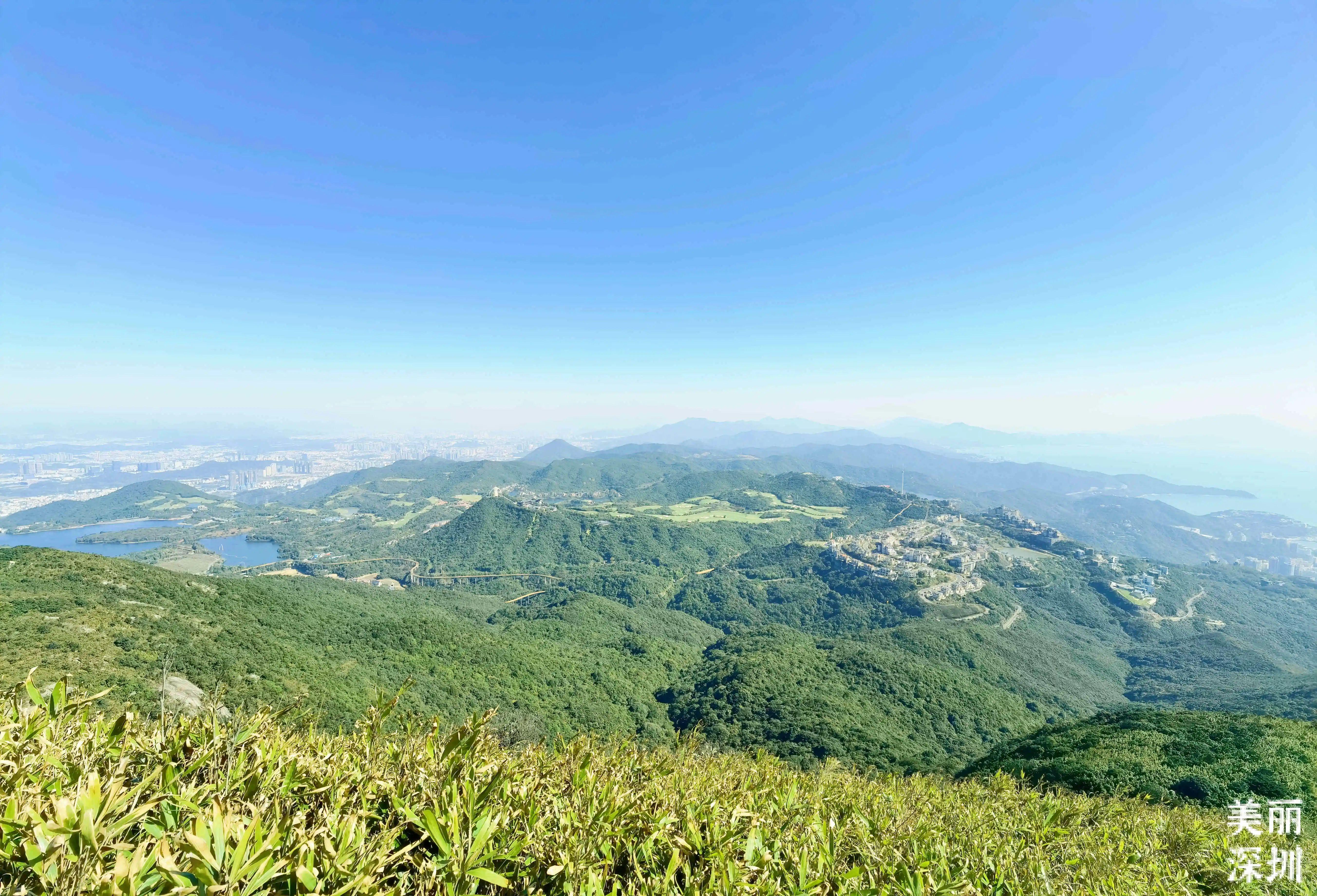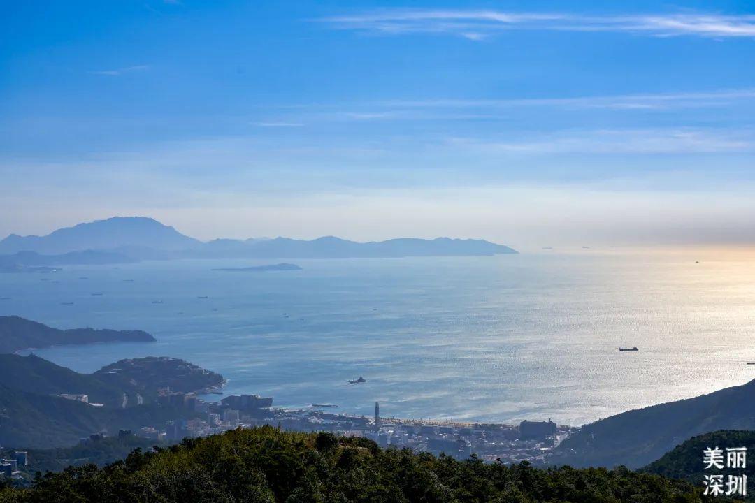 登上山顶瞭望,盐田港、大小梅沙、三洲田风景区尽收眼底;西北方向的横岗片区、东北方向的坪山城市群和西南方向的罗湖高楼静伫云雾中,蔚为壮观;南方香港西贡群山和海湾豁然呈现于眼前,海天一色,景色绝佳。