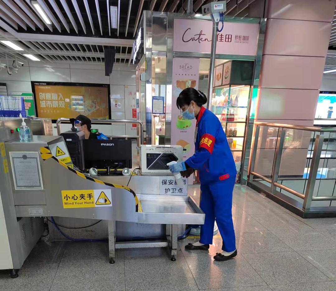 对安检机、闸机、测温枪、售票机等公共设备各车站消毒人员在严格实行“小时消毒制”的基础上,还会根据客流变化与实际情况需求,灵活增加消毒频次、深化细化消毒工作内容。