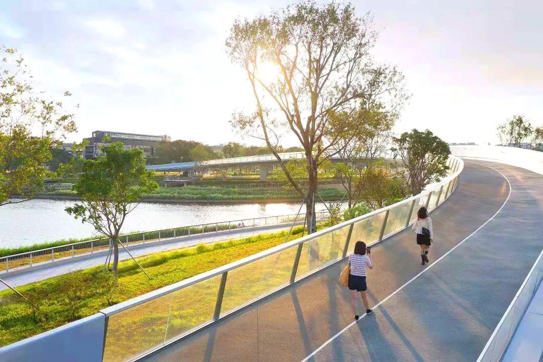 廊桥包含9大特色区段、8种植物主题、7处艺术广场、6段特色地下空间、多处桥面休憩空间,公共绿地面积累计达41925平方米,是集生态、观景、服务、艺术、交通为一体的创新城市复合空间。通过廊桥连接,可让体育中心、图书馆、商务区、滨海文化公园等重要节点串珠成链。