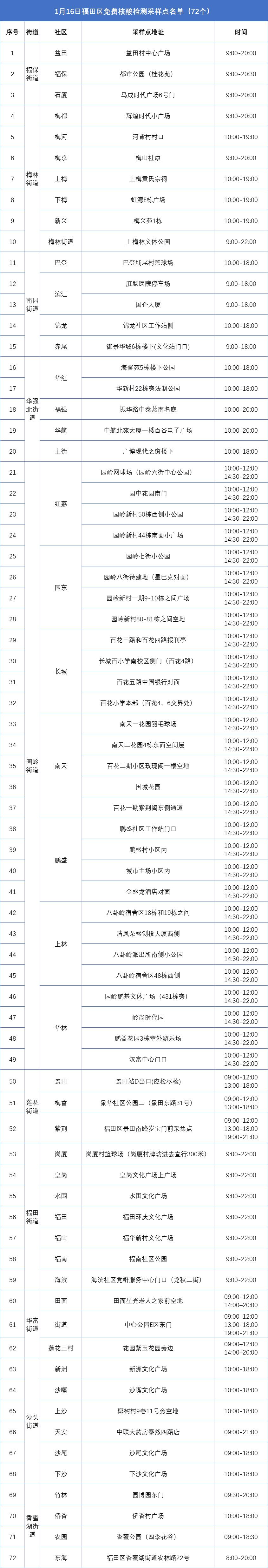 需要注意是,免费核酸检测采样点名单及检测时间将根据实际情况进行动态调整,请市民持续留意本篇推文的留言区,后续如采样点有变化,我们将在置顶位置发布相关信息。