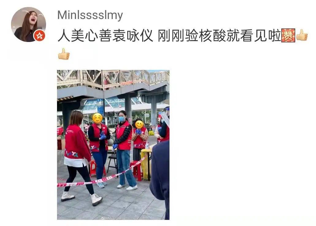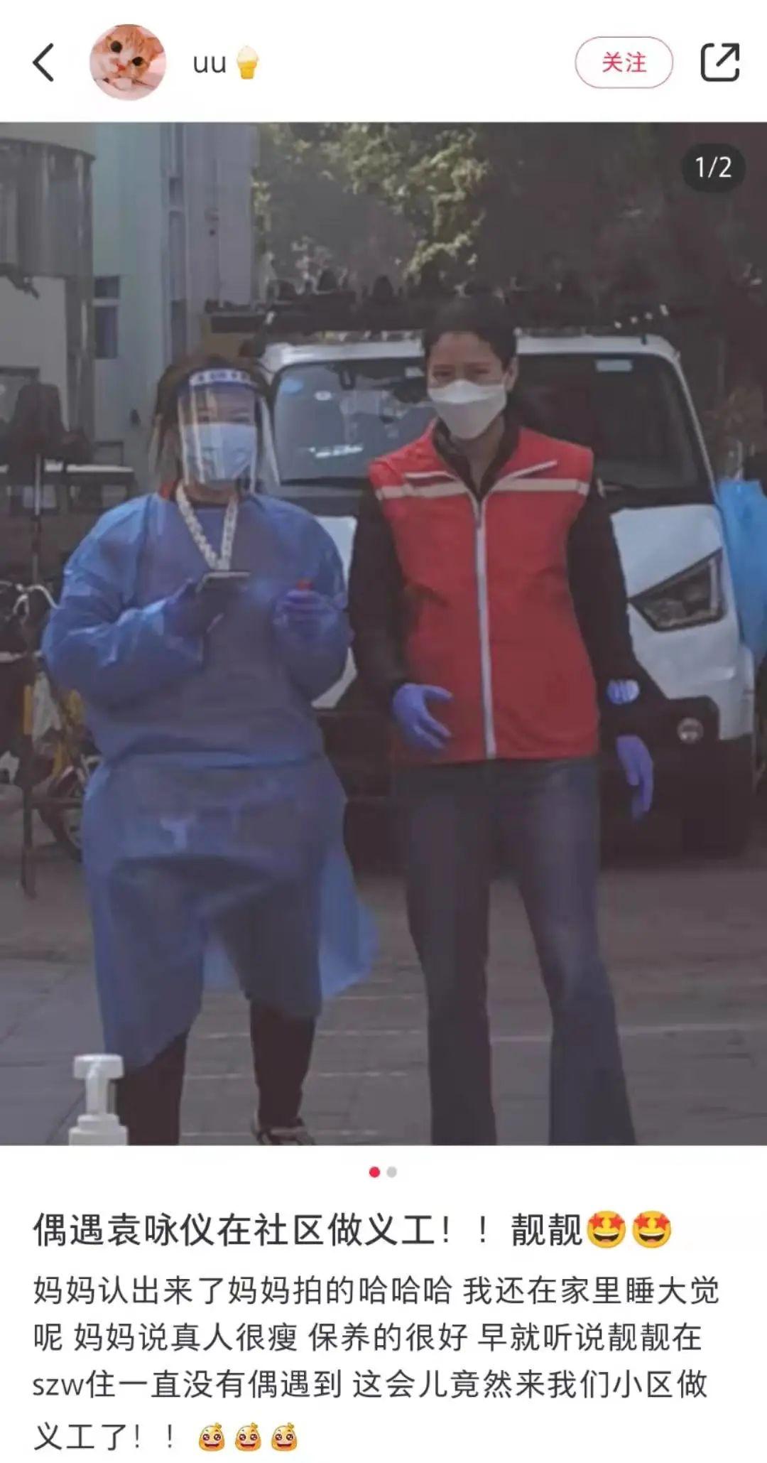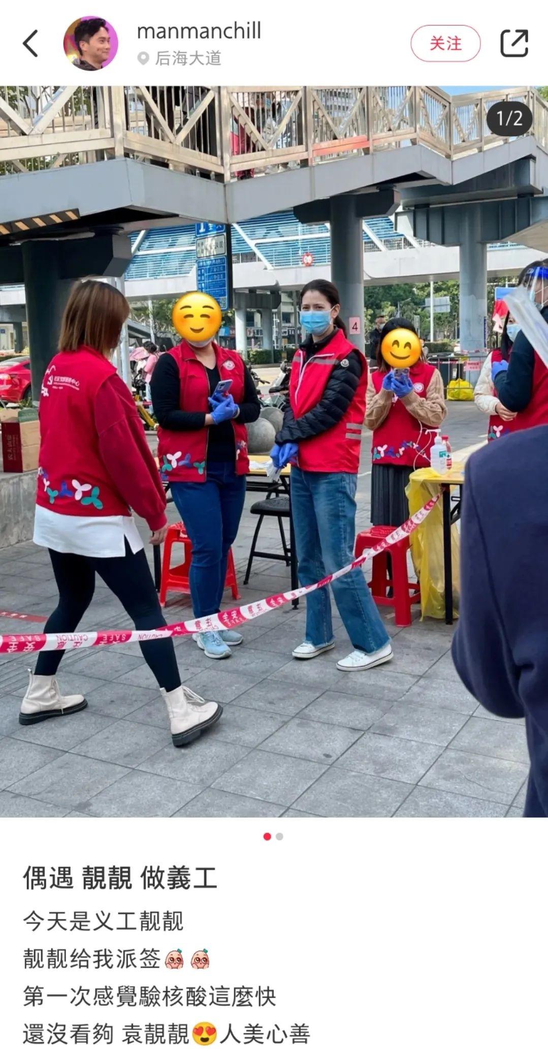 社区工作人员表示,早上9点许,袁咏仪就和朋友俩人来到核酸采样点,在了解清楚核酸采样的整个流程后,就领到了在核酸采样等待区发放检测凭证的工作。“做得非常认真,到了午餐点,她让其他工作人员先吃,自己晚点吃。”“跟社区其他志愿者一样,她就是一个热心志愿服务的普通市民。”工作人员对记者说,但与其他志愿者不同,袁咏仪说话较少,尽量不说长句,因为她的港腔太重了,怕引起关注。