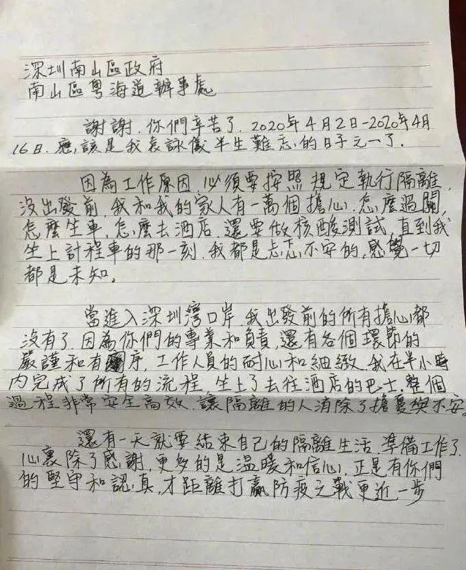 4月15日,她即将结束隔离。为对这期间辛苦的工作人员表示感谢,她写了一封信向南山区政府和“网红街道”粤海街道办事处致谢,回忆了当时在深圳湾口岸半小时就完成所有流程、前往酒店隔离的过程,点赞了深圳政府一系列安全高效的隔离措施。